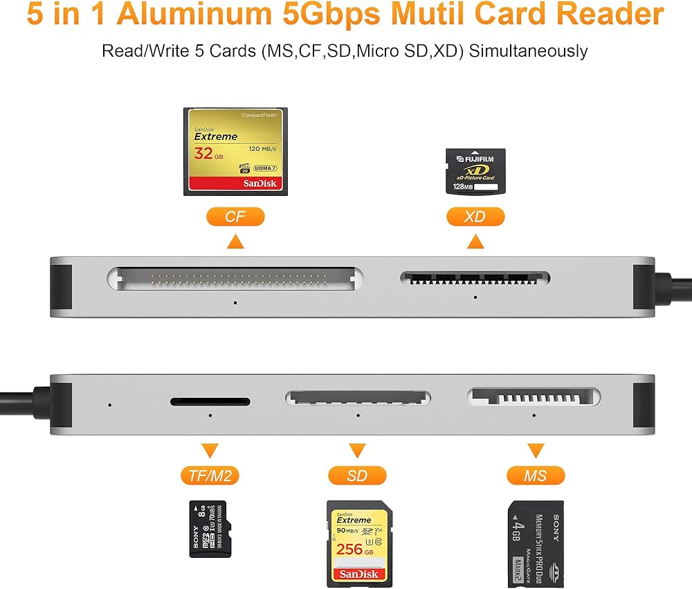 قارئ بطاقات 6 في 1: قارئ بطاقات الذاكرة المتعدد هذا مجهز بفتحات بطاقات SD/TF/M2/MS/CF/XD. يدعم بطاقات XD، SDXC، SDHC، SD، CF، MS، Micro SDXC، Micro SDHC، Micro SD، M2 وما إلى ذلك. بالإضافة إلى ذلك، يمكن لقارئ Memory Stick Pro الثنائي قراءة وكتابة 5 بطاقات مختلفة في نفس الوقت، مما يمكنه بشكل كبير تحسين كفاءة عملك