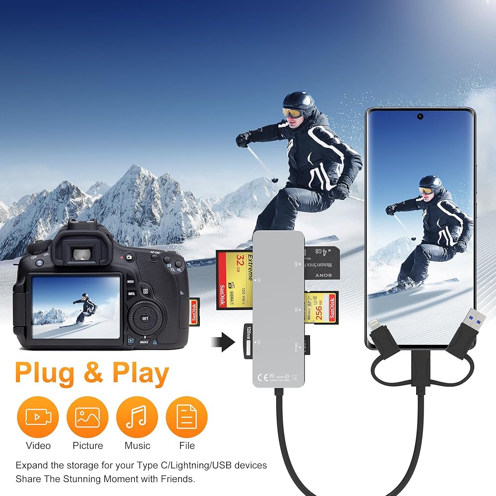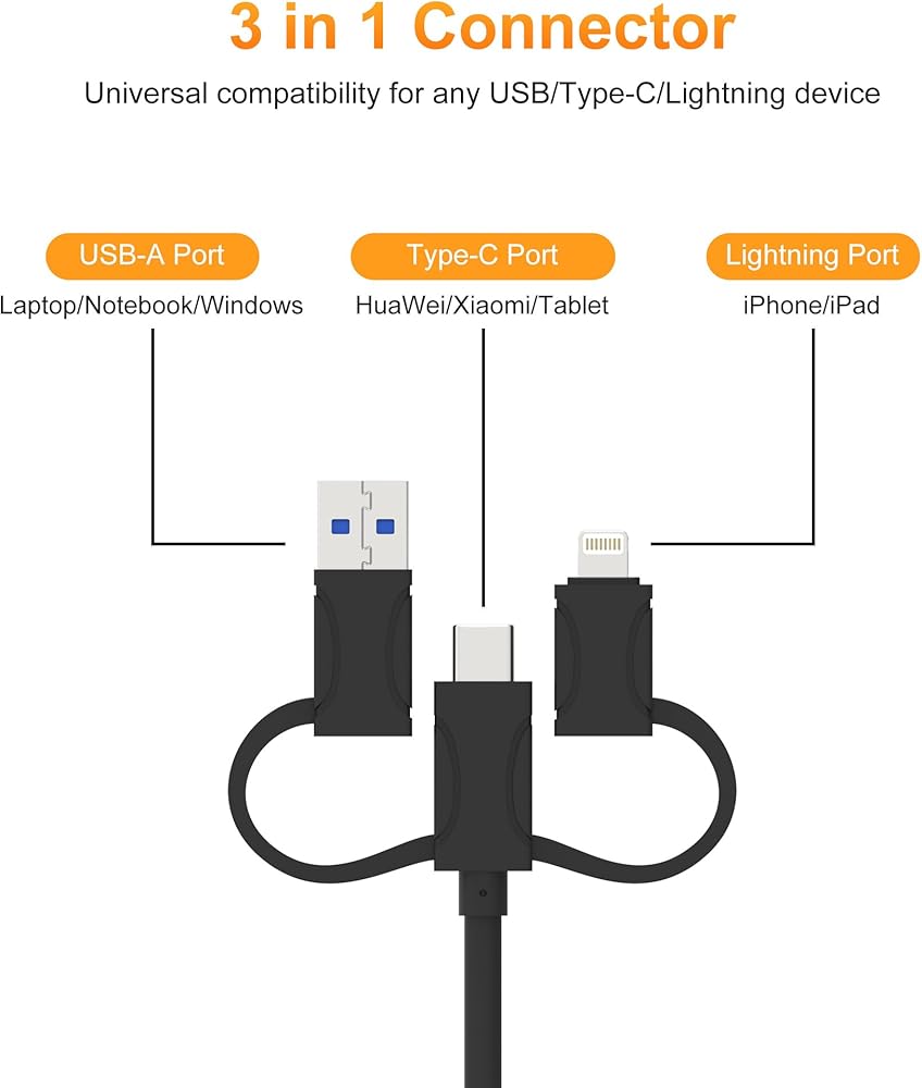 تصميم Lightning+USB C+USB A بثلاثة موصلات: محول بطاقة الذاكرة مجهز بموصل Lightning+USB C+USB 3.0 3 في 1، وهو متوافق مع مجموعة متنوعة من الأجهزة مما يضمن سهولة الاستخدام على أجهزة الكمبيوتر المكتبية والأجهزة اللوحية والهواتف المحمولة -pad والهواتف الذكية USB-C. يترك الكابل بطول 17 سم مساحة أكبر للمنافذ الأخرى دون حجبها