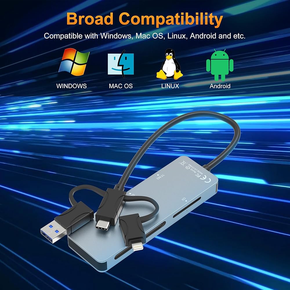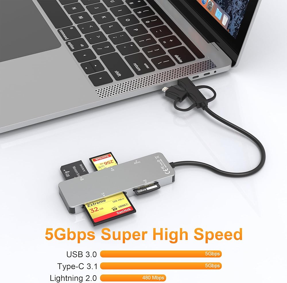 نقل فائق السرعة بسرعة 5 جيجابت في الثانية: مع نقل البيانات بسرعة 5 جيجابت في الثانية، يمكنك نقل الصور ومقاطع الفيديو من بطاقتك إلى هاتف i-Phone /Pad/ Android / الكمبيوتر قريبًا، مما يوفر الكثير من الوقت ويحسن كفاءة عملك. مناسب للمصورين والاستوديوهات وأولئك الذين يحتاجون إلى نقل الملفات الكبيرة. كما أن قارئ بطاقة USB3.0 متوافق مع منفذ USB2.0/1.1. (ملاحظة: سرعة 5 جيجابت في الثانية فقط لمنفذ USB C وUSB A، سرعة موصل Lightning هي 480 ميجابت في الثانية)