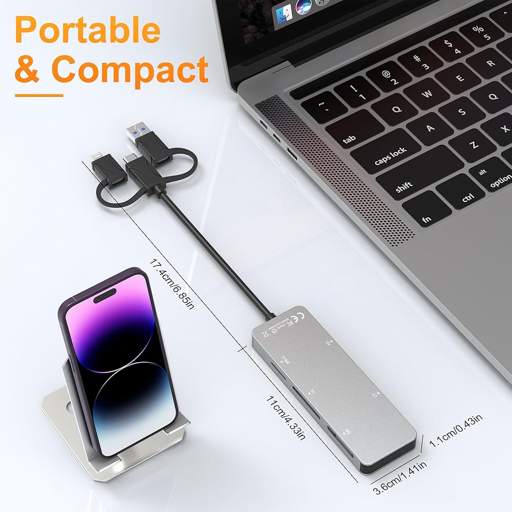 محول Memory Stick pro Duo لأجهزة iPhone - 6 في 1 SD/TF/M2/CF/MS/XD قارئ بطاقات للكمبيوتر/iPhone/USB C، الألومنيوم Lightning+USB A+USB C محول Memory Stick pro Duo يدعم Micro SD/SDHC /XD