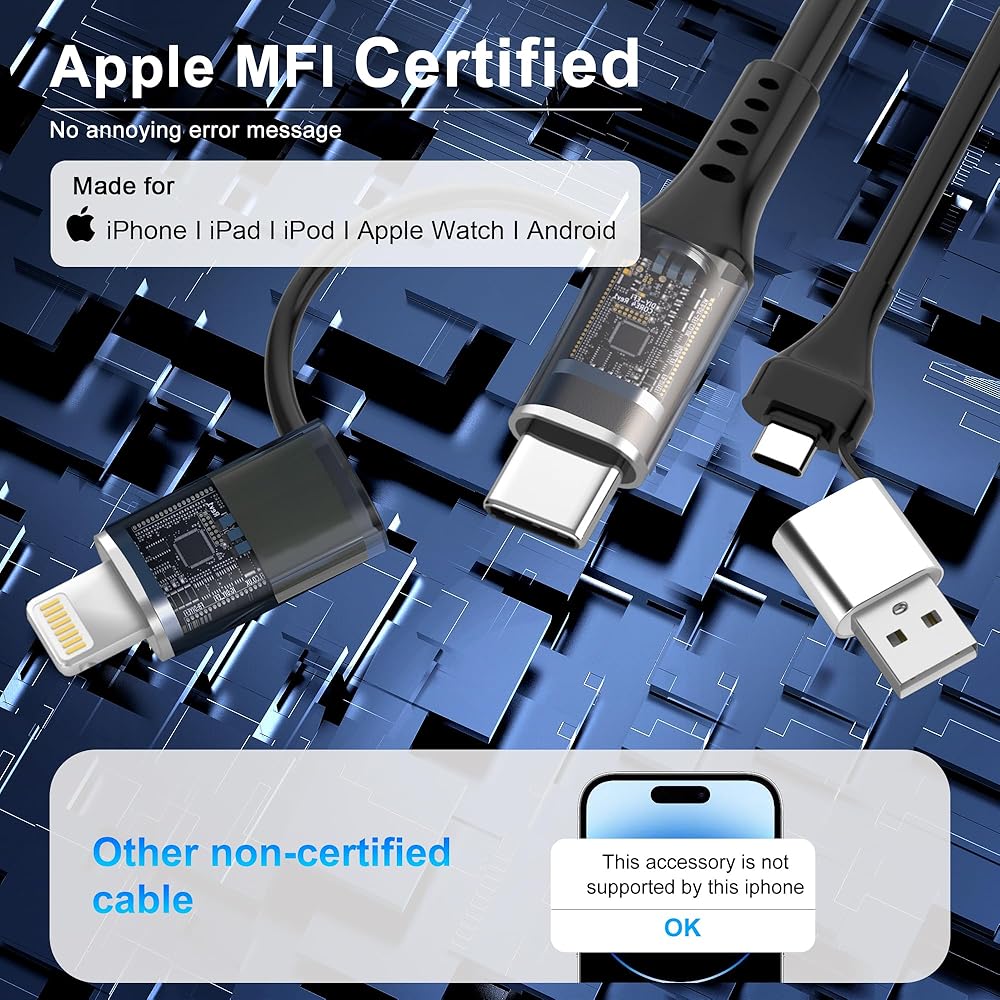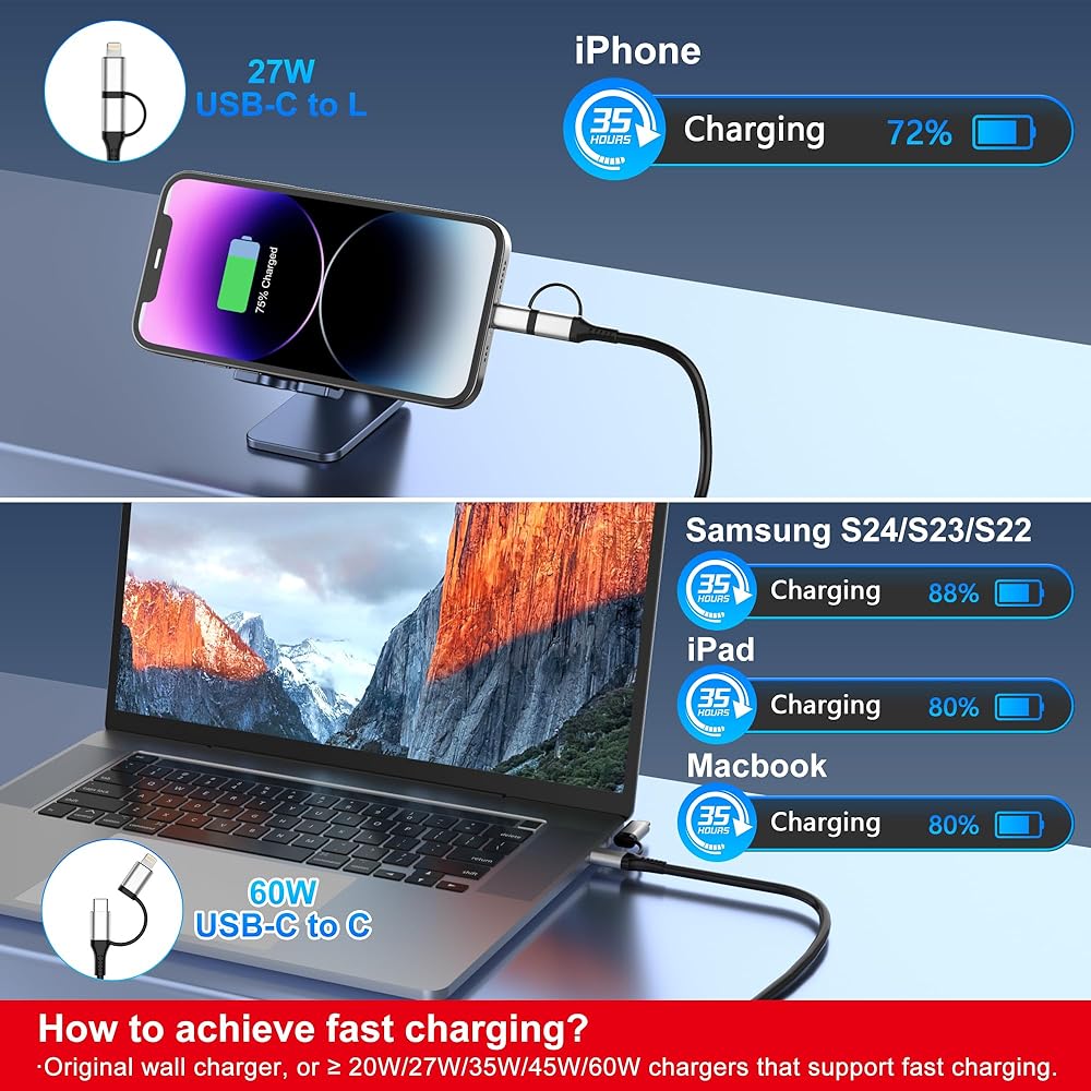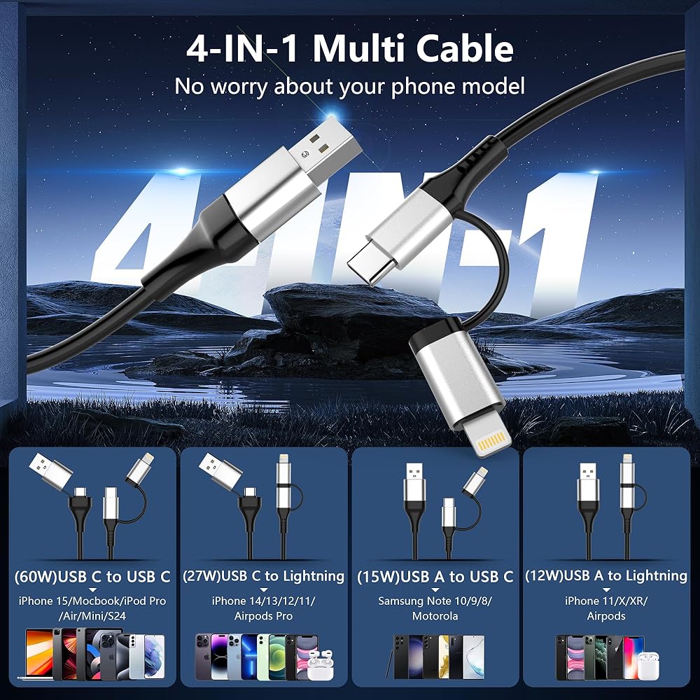 [كابل USB C وLightning 4 في 1]: يجمع كابل USB C وLightning الخاص بنا بين 4 منافذ في كابل واحد (USB C إلى USB C، USB C إلى Lightning، USB A إلى USB C، USB A إلى Lightning)، مما يلغي الحاجة لحمل كابلات متعددة للأجهزة المختلفة.