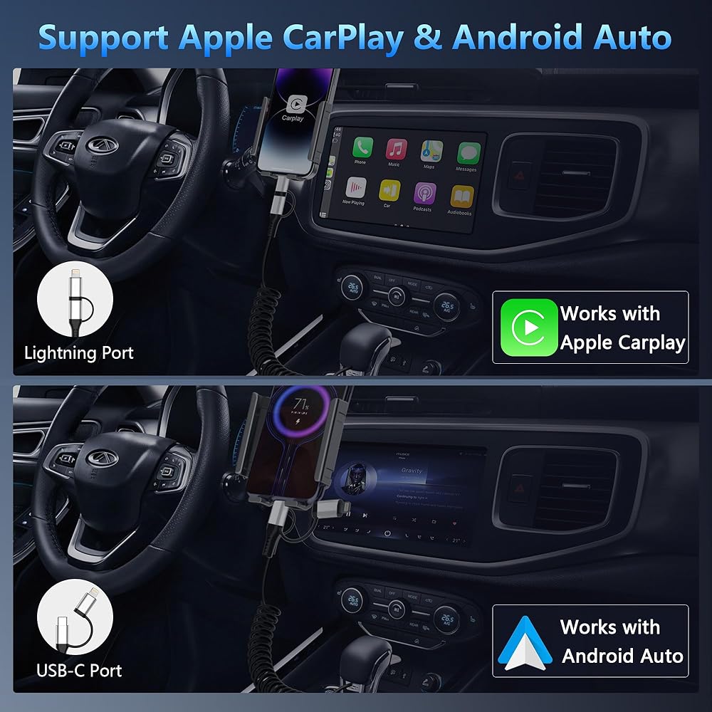 [كابل Apple CarPlay وAndroid Auto]: يدعم كابل carplay هذا Apple CarPlay وAndroid Auto، ويدعم كابل USB C أحدث سلسلة iPhone15 وcarplay. كما يوفر كابل Lightning الملتف وكابل USB C مساحة في سيارتك، لذلك قل وداعًا لكابلات الشحن المزدحمة.
