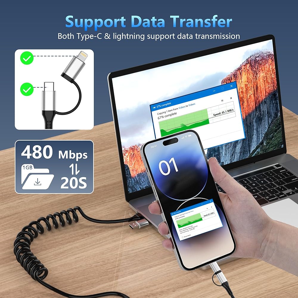 [الشحن السريع ونقل البيانات]: يدعم شاحن السيارة USB هذا الشحن عالي السرعة (60 وات/27 وات) ونقل البيانات بسرعة (480 ميجابت في الثانية)، وملفات 1 جيجا في 20 ثانية. في 30 دقيقة، يمكن لـ USB C إلى USB C شحن هاتف Sam sung من 0 إلى 80% وiPhone15 من 0 إلى 75%، ويمكن لـ USB C إلى Lightning شحن iPhone14/13/12 من 0 إلى 70%.