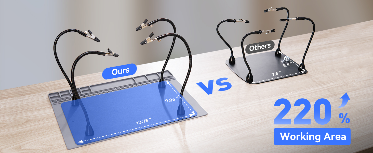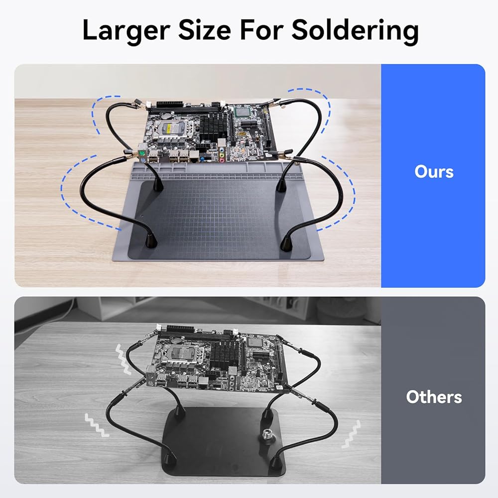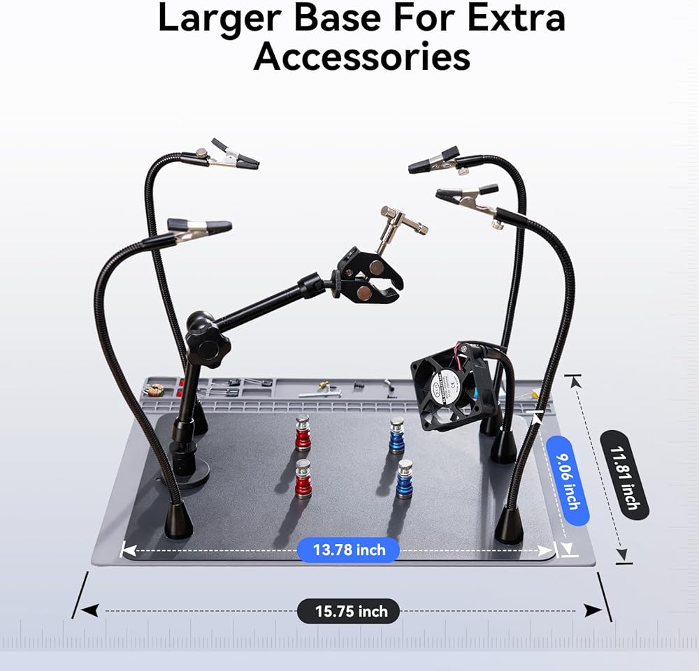 حجم أكبر للحام: مجهزة بساط لحام مقاس 15.8x11.8 بوصة وقاعدة حديد مقاس 13.9x9.1 بوصة، يوفر الحجم الأكبر لأيادي مساعدة اللحام TOMLOV مساحة عمل واسعة للملحقات الإضافية (غير متضمنة)، مما يعزز الكفاءة في مهام اللحام.