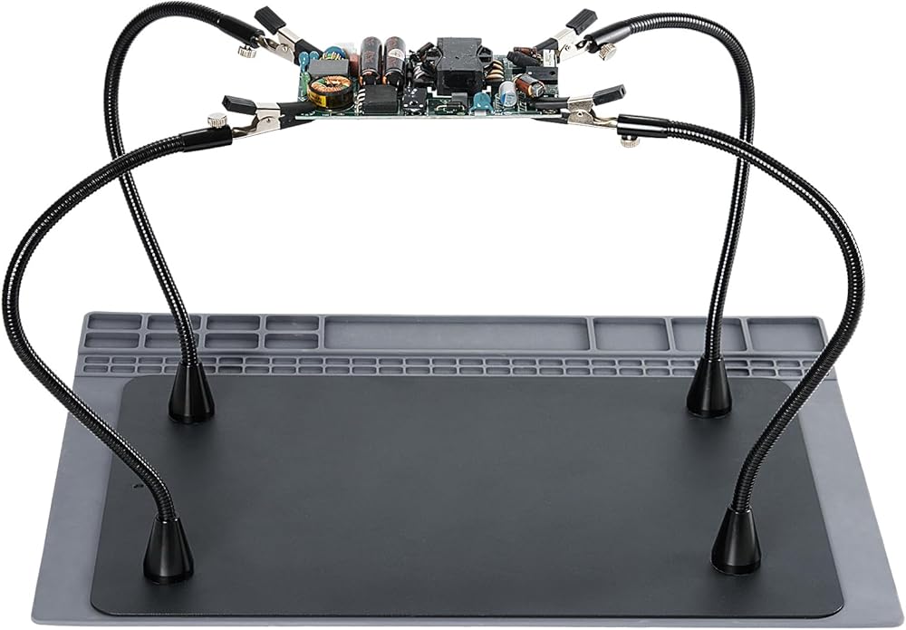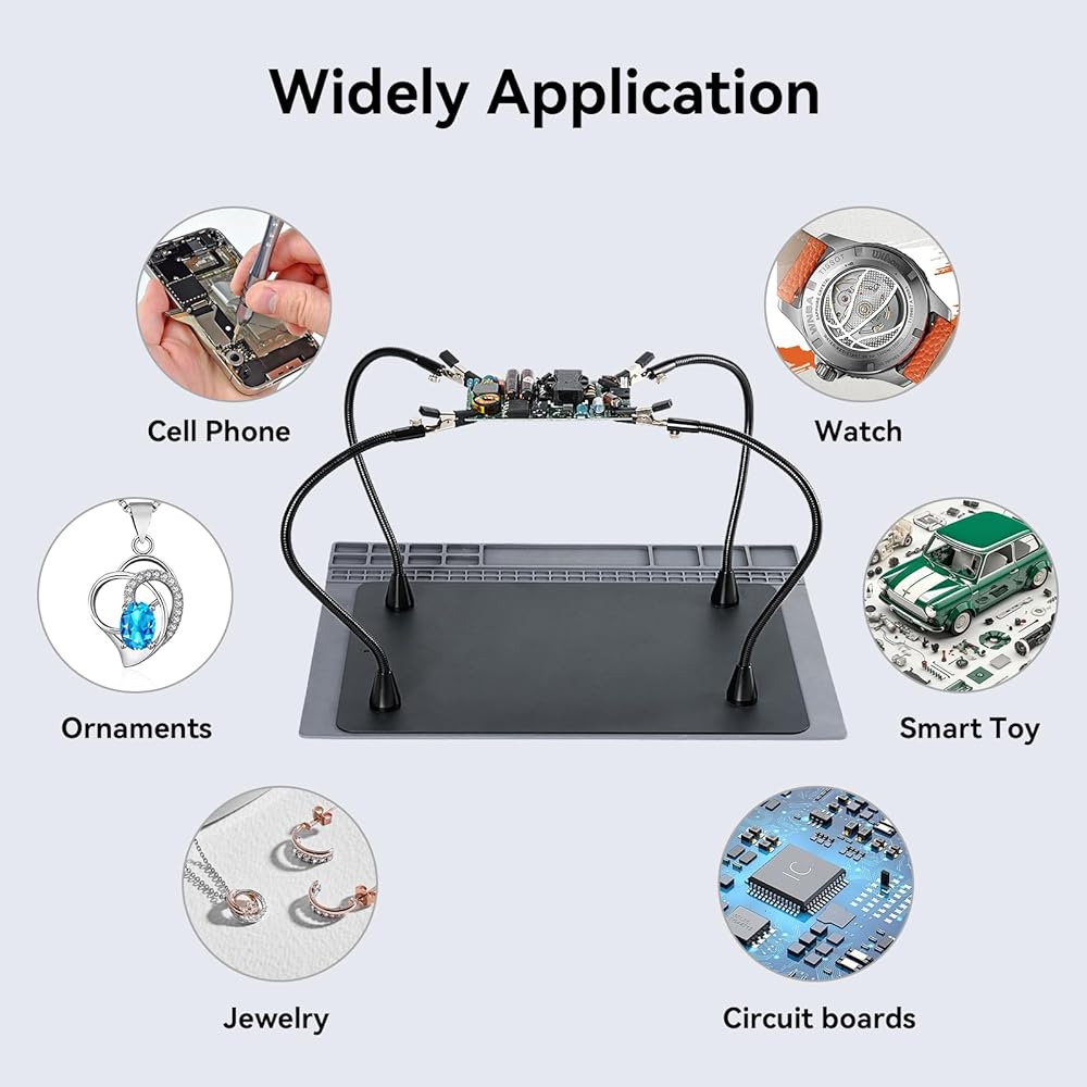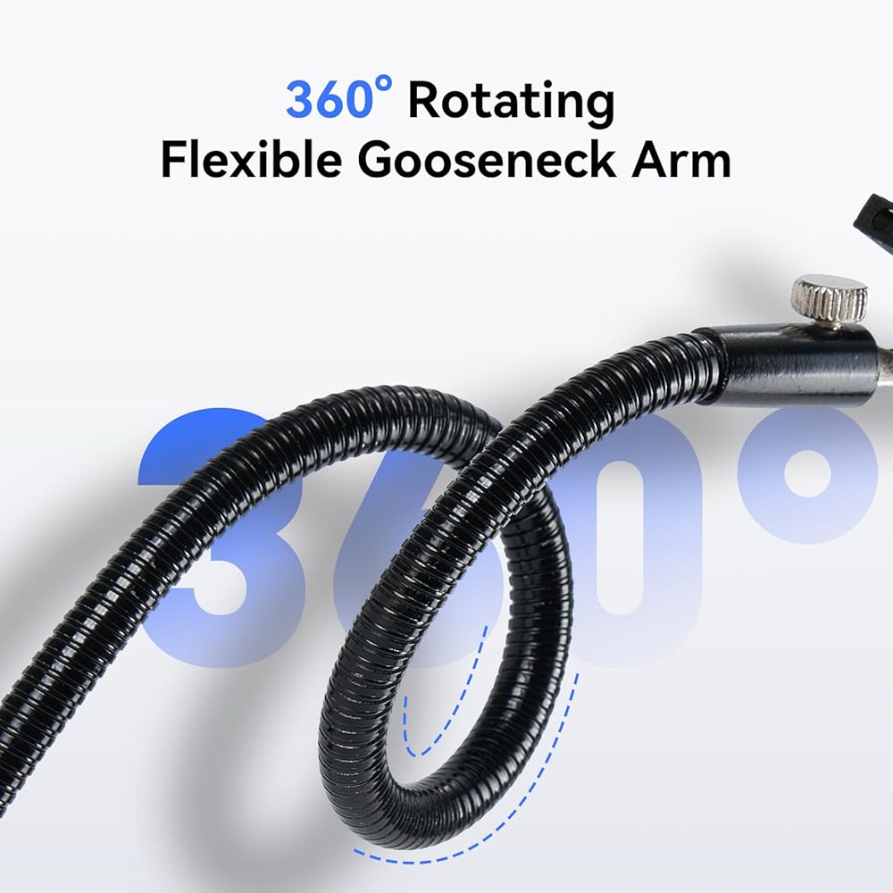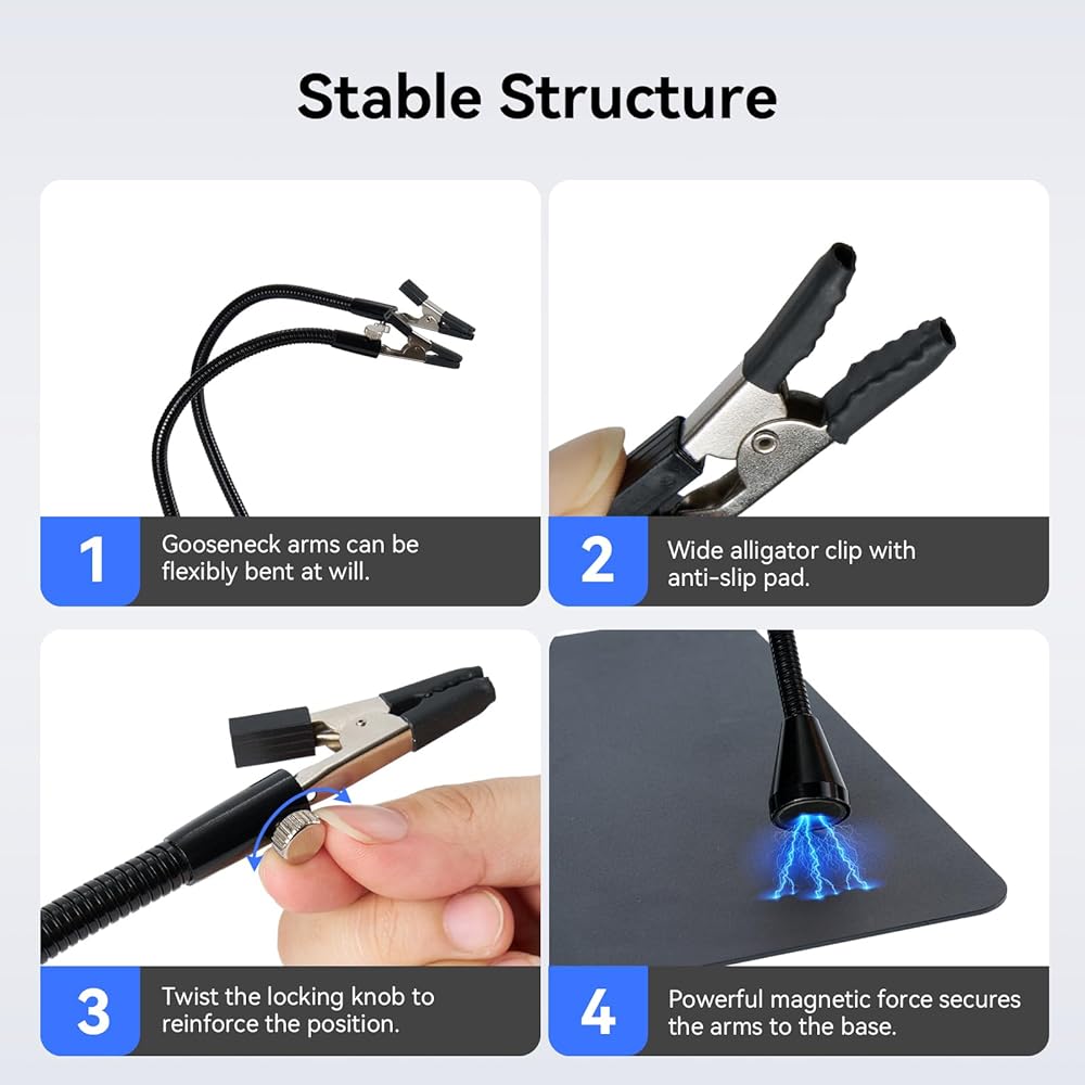ذراع معقوفة مرن: أربعة أذرع مرنة معقوفة لمجموعة اللحام تدور 360 درجة وتنحني إلى الزاوية أو الارتفاع المطلوب؛ يحتوي كل ذراع على قاعدة مغناطيسية قوية، مما يضمن الثبات أثناء المهام، مما يجعل تحديد المواقع دقيقًا وسهلاً