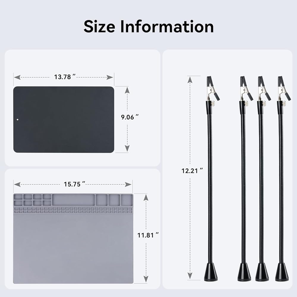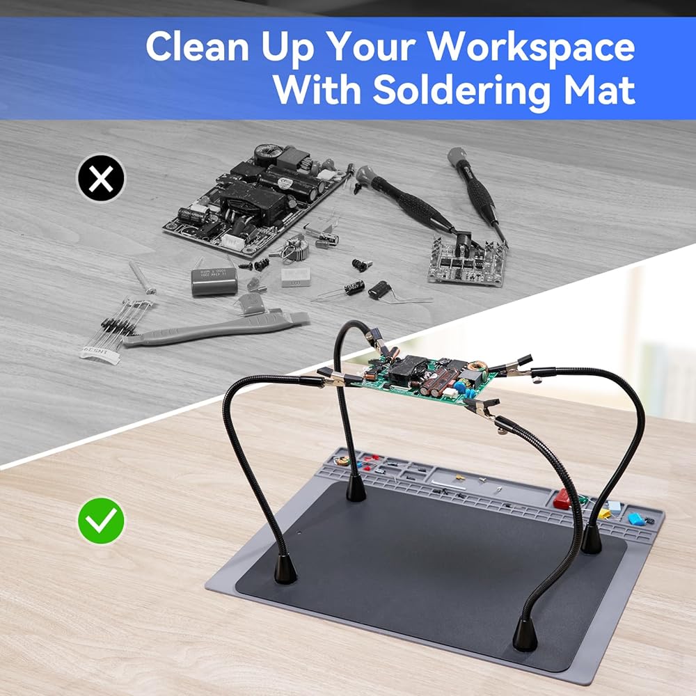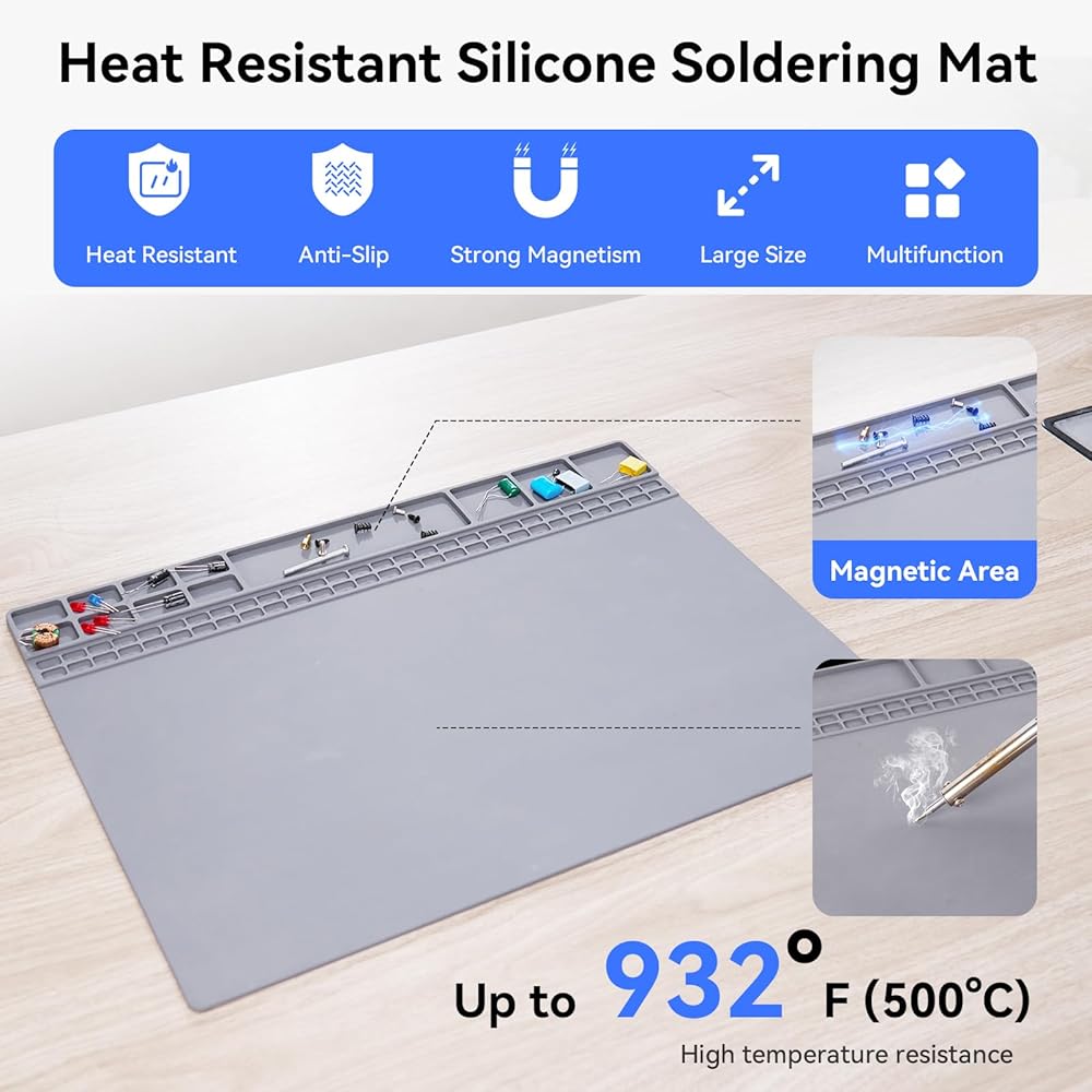 حصيرة لحام مغناطيسية مقاومة للحرارة: تتضمن حصيرة اللحام المقاومة للماء والحرارة، وهي جزء من أداة اللحام اليدوية الثالثة، منطقة مغناطيسية لحمل البراغي الصغيرة، مما يحافظ على مساحة العمل الخاصة بك منظمة مع منع الضرر الناتج عن الحرارة ويجعلها سهلة التنظيف.