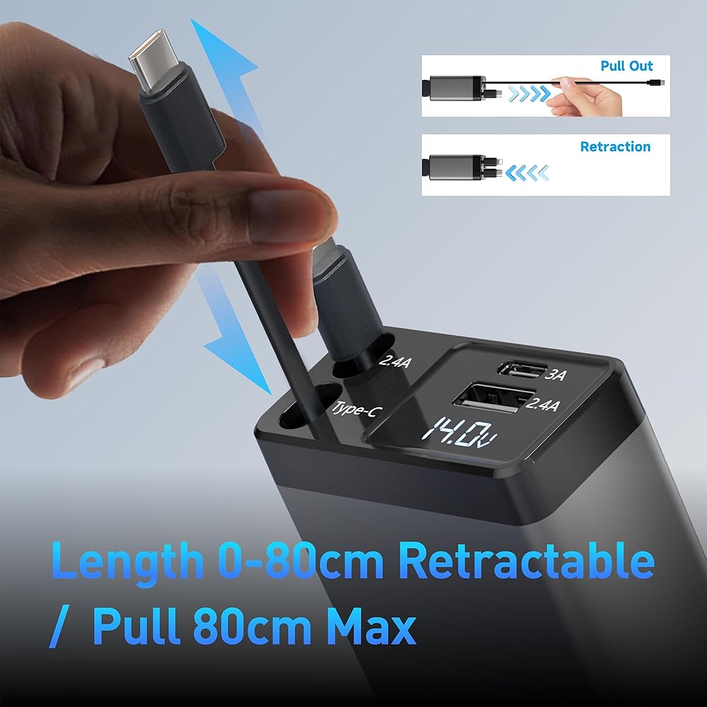 🚙يمكن أن يصل طول شاحن السيارة AOPREZON القابل للسحب لشاحن السيارة إلى أقصى طول 32 بوصة. عند سحبه إلى الطول الذي تحتاجه، سيتوقف شاحن الهاتف القابل للسحب تلقائيًا عند تحريره. عند سحبه مرة أخرى، سوف يتراجع كابل الشحن تلقائيًا مرة أخرى إلى الشاحن. وهو أمر مريح للغاية. نقدم أيضًا كابل شحن USB-C إلى USB-C كنسخة احتياطية.