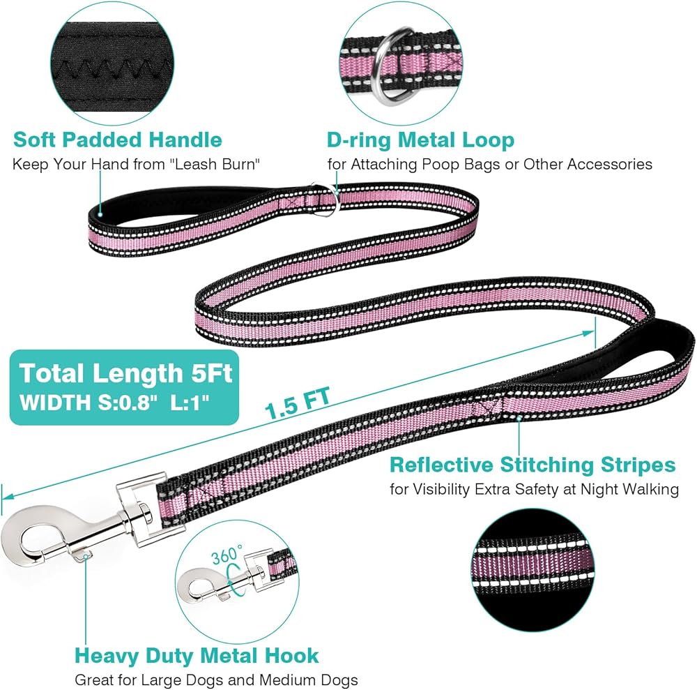 SIZE OPTIONS adn SERVICE:There are 4 colors and 2 sizes to choose.(Colors:Red/Pink/Blue/Black.Size: S-Width:0.8",Length:5 Ft/L-Width:1",Length:5 Ft.)If you have any questions about our dog training leash,please contact us anytime,we will reply and solve your essue in 24 hours.