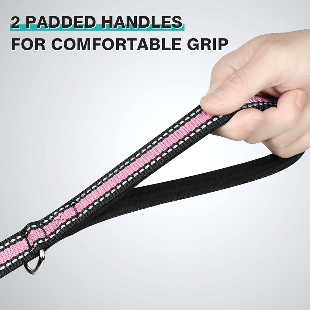 SOFT PADDED HANDLES:The heavy duty dog leash has 2 soft padded handles,one for close control and another one for usual walking.Soft and comfotable material are nice for pet owner's hands.