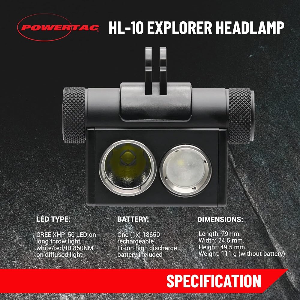 • مصباح يدوي فائق السطوع - يوفر مستكشف HL-10 ضوءًا ساطعًا بحد أقصى يبلغ 2500 لومن. تتميز برمي ضوء قوي لمسافة 100 متر مع إعدادات تشمل الفيضانات والتركيز والضوء الموضعي وأوضاع الإضاءة المنتشرة: الضوء الأبيض والأحمر وضوء الأشعة تحت الحمراء.