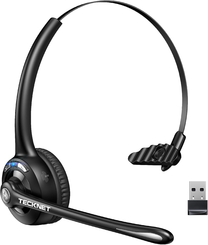 سماعة رأس لاسلكية TECKNET، سماعات بلوتوث مع ميكروفون لإلغاء الضوضاء لسائقي الشاحنات، سماعة رأس لاسلكية بدون استخدام اليدين مع ميكروفون كتم الصوت للهاتف المحمول/الكمبيوتر الشخصي/المنزل/المكتب/مركز الاتصال (USB Dongle)