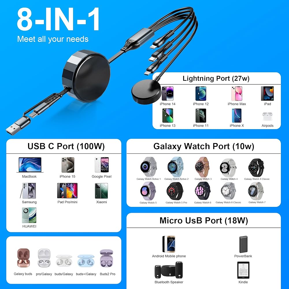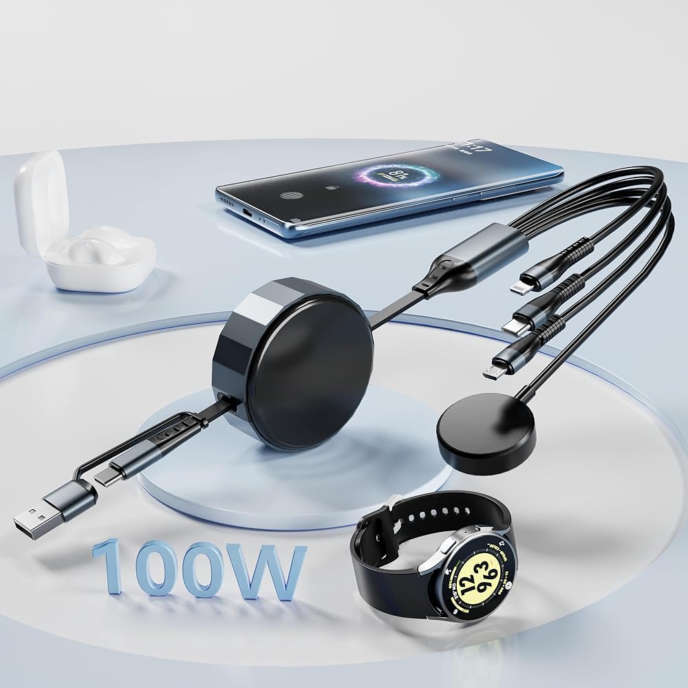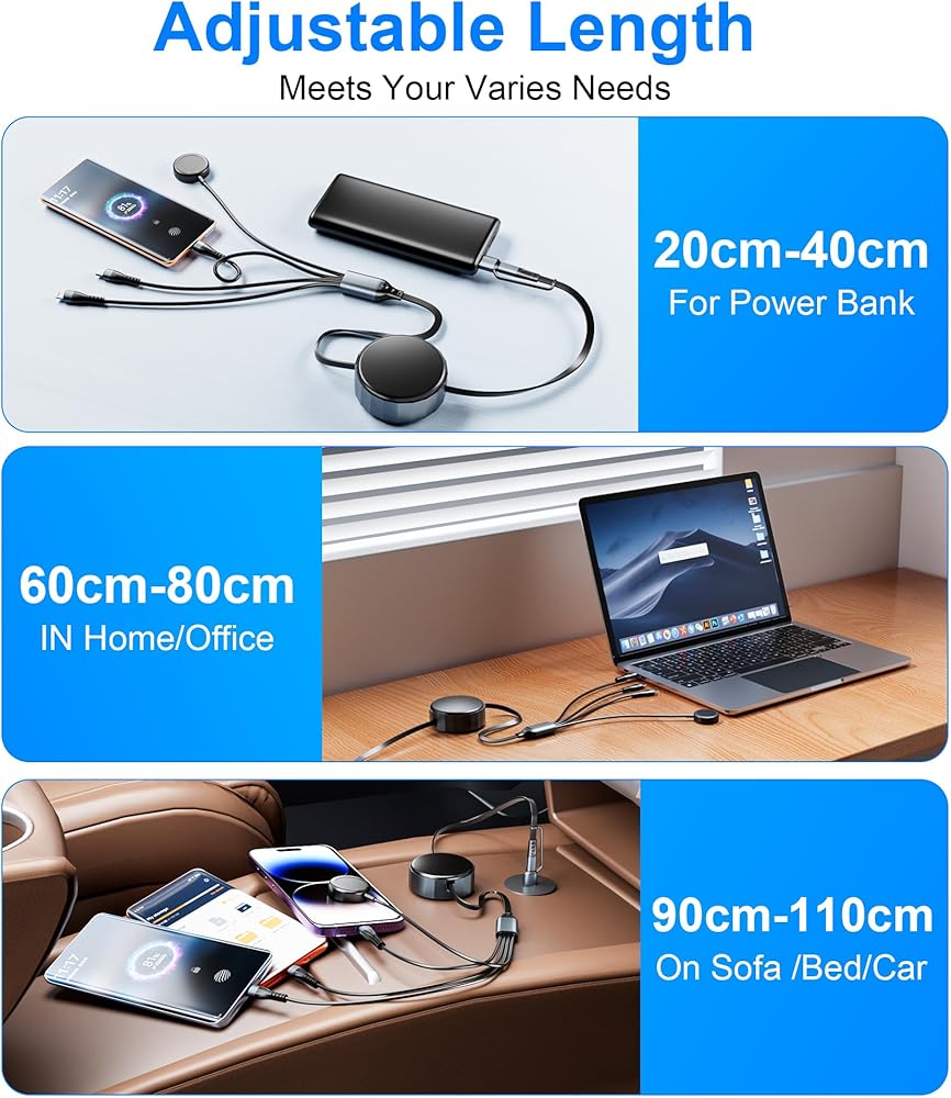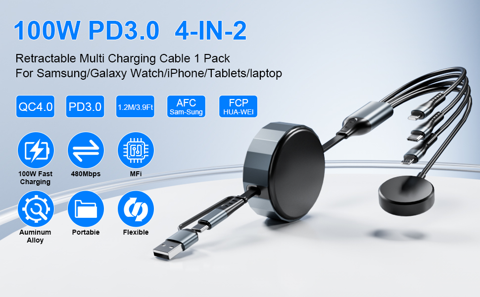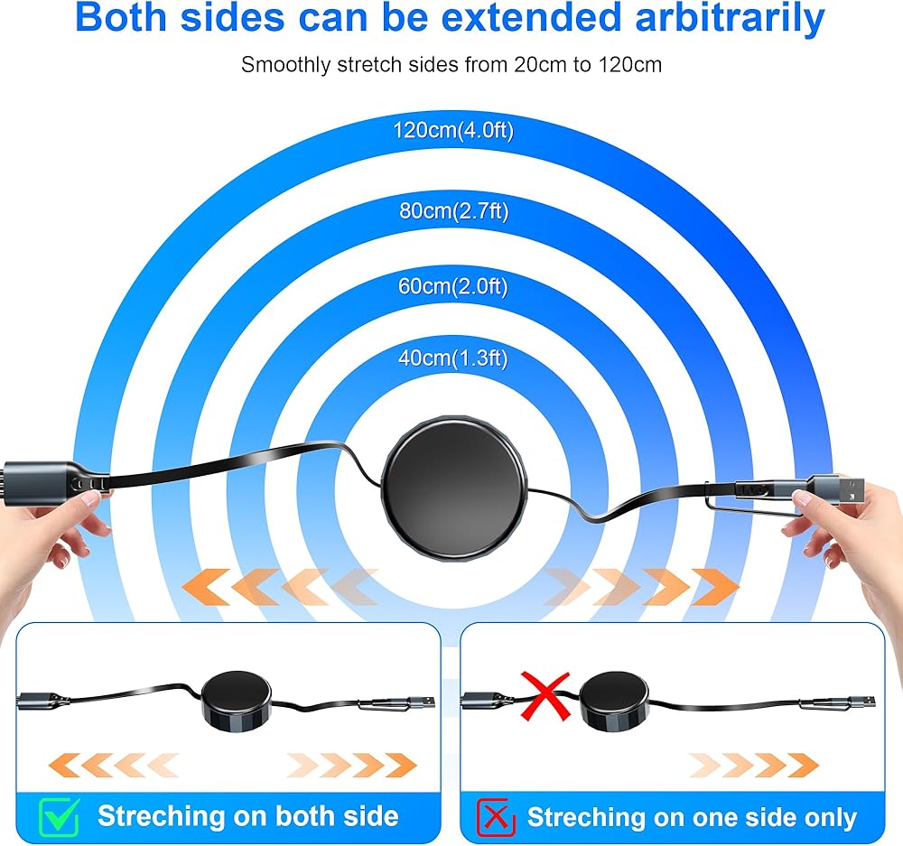 5 أطوال قابلة للسحب - مريحة بشكل لا يصدق!!: كابل يو إس بي سي وكابل لايتنينج قابل للسحب بطول إجمالي 4 أقدام/1.2 متر، يوفر 5 أطوال قابلة للتعديل: 1 قدم - 1.3 قدم - 2 قدم - 2.7 قدم - 4 قدم. يجب سحب سلك شاحن الساعة وiPhone من كلا الطرفين من الكابل في نفس الوقت، سوف يمتد أو يتراجع تلقائيًا إلى الوضع الأصلي. تصميم قابل للسحب يسهل وضعه في حقائب اليد أو حقائب الكمبيوتر المحمول أو الجيوب. منع التشابك والفوضى