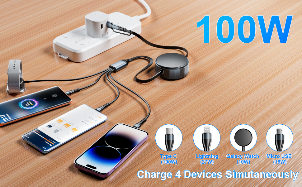 شحن سريع قابل للسحب 4 في 2: شاحن ساعة سامسونج جالاكسي 4 في 2 مجهز بمنفذ USB A/Type C 2 في 1 مع 4 موصلات: شاحن ساعة Galaxy المغناطيسي، Type-C، Micro USB، وموصل البرق. يمكنه شحن ما يصل إلى 4 أجهزة في نفس الوقت، وعندما تخرج للسفر المكتبي، تحتاج فقط إلى حمل رفيق السفر هذا، مما يوفر الراحة لحياتك اليومية. بالإضافة إلى ذلك، يدعم كابل USB C نقل البيانات بسرعة 480 ميجابت في الثانية (المخرجات الأخرى تدعم الشحن فقط)، مما يسمح بنقل البيانات والشحن في نفس الوقت