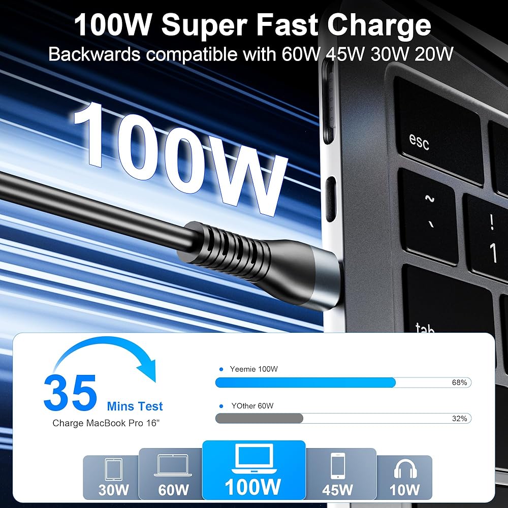 كابل شحن فائق السرعة 100 واط PD: أحدث كابل شحن متعدد 100 واط يعتمد شريحة PD 3.0 الذكية، كابل شحن فائق السرعة USB C إلى USB C يوفر سرعة شحن تصل إلى 6A/100W (كحد أقصى)، متوافق مع بروتوكولات الشحن السريع المتعددة مثل PD3 .0/PPS/QC3.0 /QC2.0/BC1.2/APPLE 2.4A/QC3.0/QC2.0/AFC/FCP/SCP، إلخ. يمكنه توفير شحن سريع لأجهزتك مثل هواتف Samsung Galaxy أو أجهزة الكمبيوتر المحمولة iPhone 15 أو iPad أو MacBook، قل وداعًا لتحذيرات انخفاض البطارية. يرجى ملاحظة: للحصول على طاقة شحن تبلغ 100 واط، يرجى استخدام شاحن بقوة 100 واط