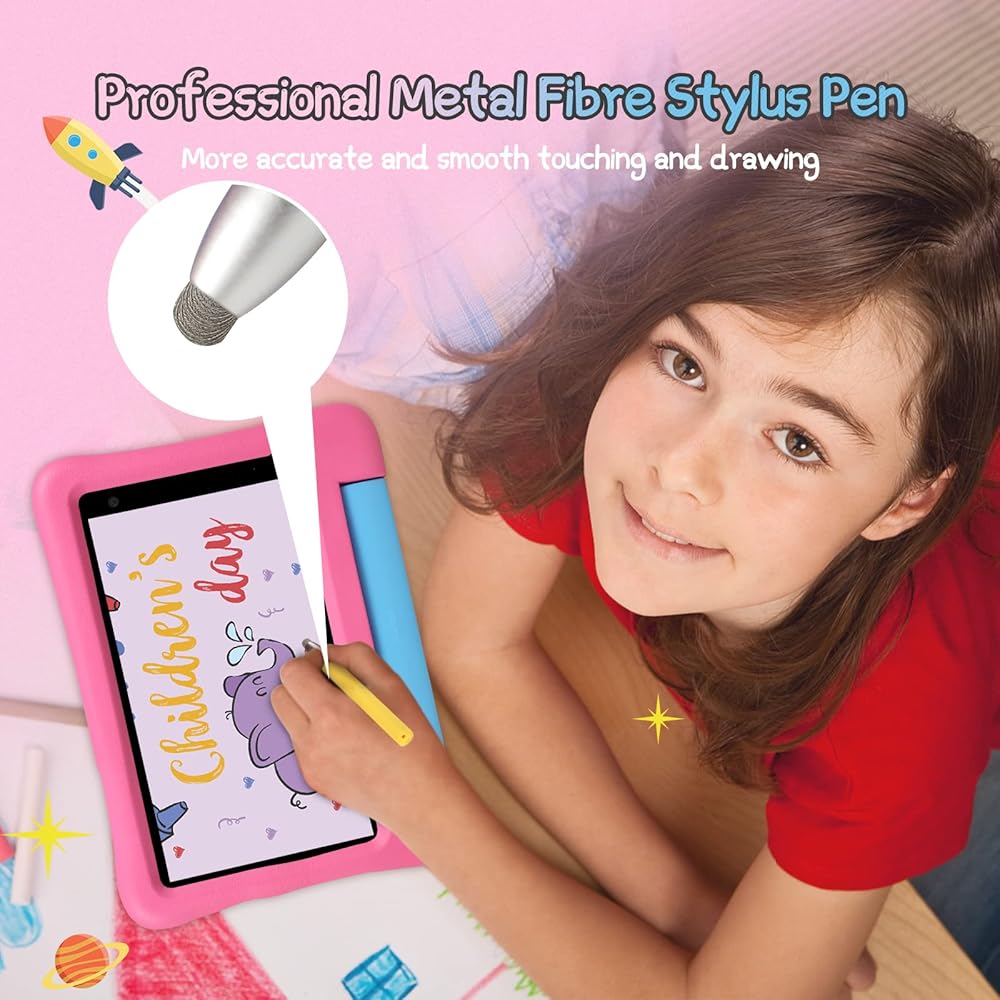 حماية كاملة بزاوية 360 درجة - تأتي وسادة الأطفال هذه مع حافظة واقية مصنوعة من مادة EVA، وهي خفيفة الوزن ومرنة، وهي ترقية كبيرة من حافظة السيليكون. بالإضافة إلى قطعة من الغشاء المقسى عالي الجودة لتقليل تكسر الشاشة، وحامل قابل للدوران بدون استخدام اليدين، وقلم من الألياف المعدنية لإضافة المزيد من المرح لاستخدام الأطفال