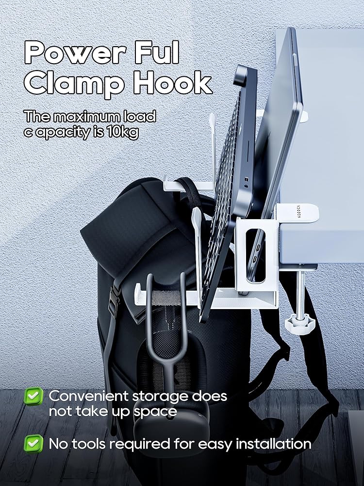 حامل سماعة الرأس/حامل وحدة التحكم في الألعاب: يوجد خطاف بطول 11.6 سم/4.5 بوصة في الجزء السفلي من حامل الكمبيوتر المحمول، والذي يمكن استخدامه لتعليق سماعات الرأس أو أجهزة التحكم في الألعاب أو القبعات وحقائب اليد، إلخ.