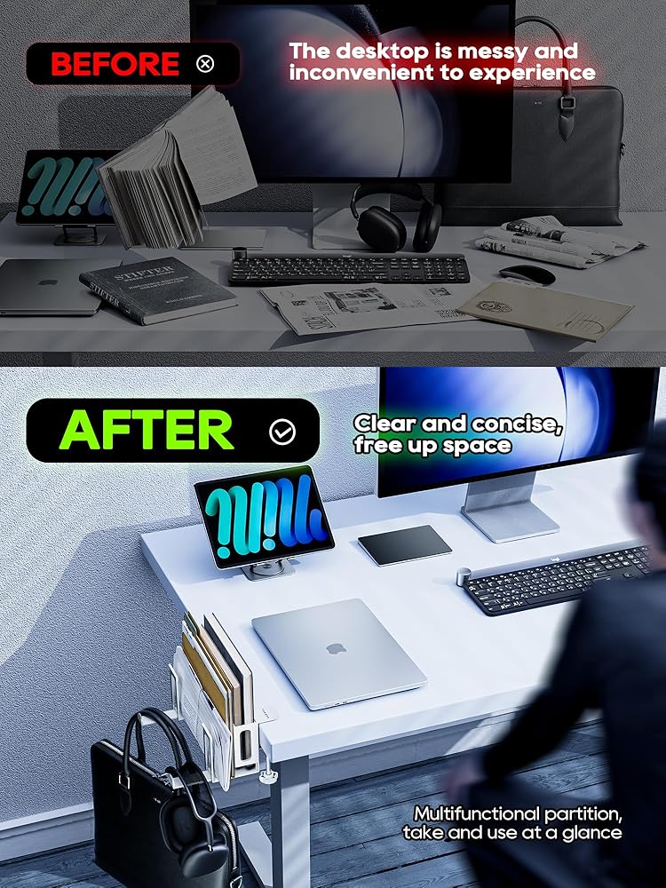 توفير المساحة: وضع التثبيت على جانب المكتب، والذي لا يشغل مساحة المكتب، مما يجعل مكتبك أكثر ترتيبًا. (يجب أن يكون العمق الفعال للمكتب أكبر من 5 سم/2 بوصة، ويجب أن يكون سمك المكتب أقل من 6 سم/2.3 بوصة)
