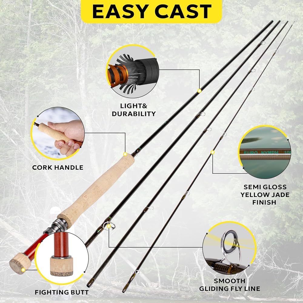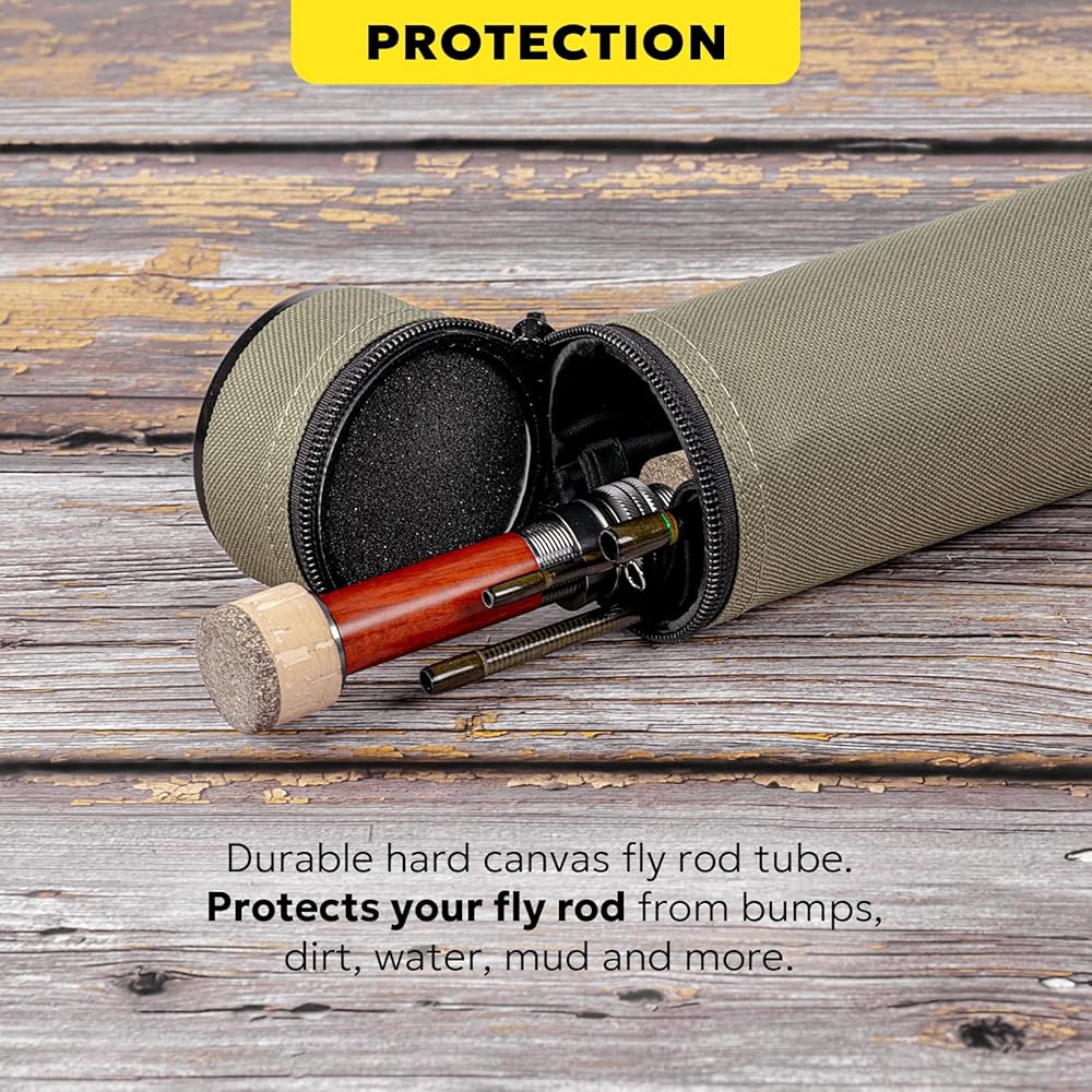 • سهل الحمل: يأتي القضيب مع أنبوب قضيب طائر من القماش الصلب المتين. يحمي قضيب الطيران الخاص بك من الصدمات والأوساخ والماء والطين والمزيد. يسمح لك تصميم أنبوب صنارة الصيد بحملها بسهولة لصيد الأسماك.