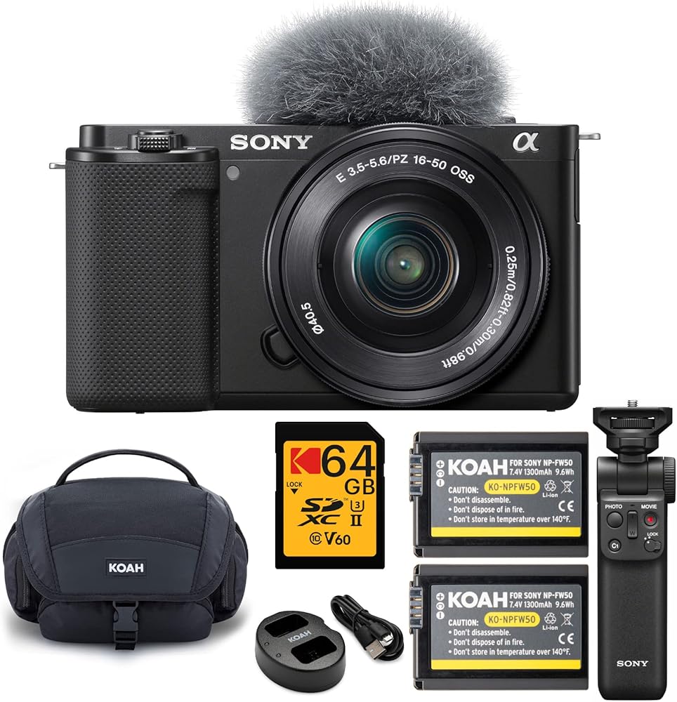 Bundle Includes: Sony Alpha ZV-E10 APS-C Interchangeable Lens Mirrorless Vlog Camera with 16-50mm Lens (Black), GP-VPT2BT Wireless Bluetooth Shooting Grip and Tripod, LCS-U21 Soft Carrying Case (Black), 64GB UHS-II U3 V60 Ultra Pro SDXC Memory Card and PRO Rechargeable 1300mAh Battery (2-Pack) and Dual Charger for Sony NP-FW50