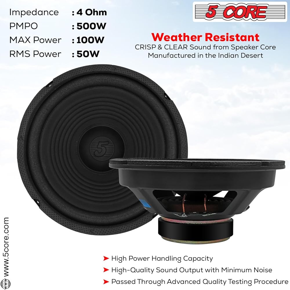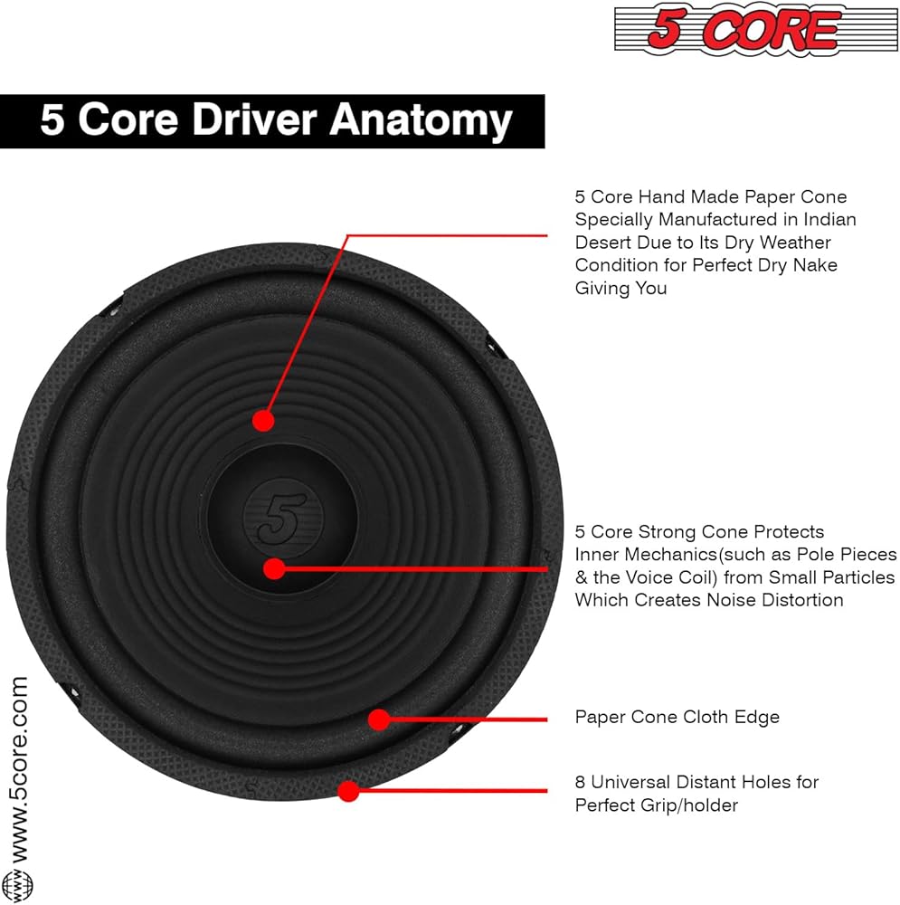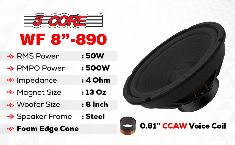 5 CORE 8 بوصة مكبرات صوت للسيارة 4 أوم، 50 وات RMS، 0.81 بوصة CCAW ملف نحاسي، 90 مم مغناطيس WF 8 "-890 1 قطعة