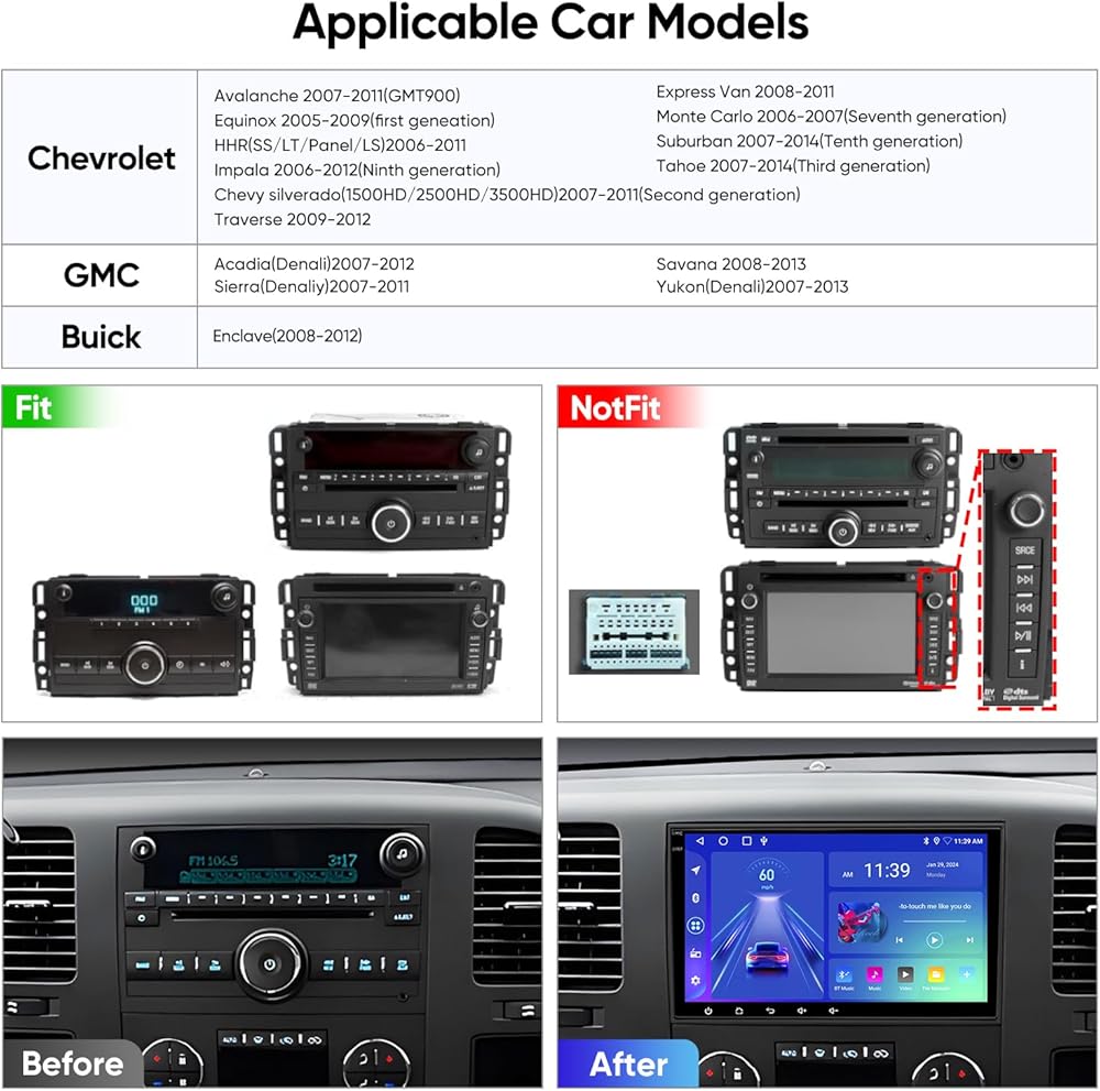 راديو السيارة من الجيل السادس من السلسلة الأساسية للقيادة الذكية الجديدة كليًا: مناسب لسيارة شيفروليه تشيفي سيلفرادو/جي إم سي سييرا يوكون/بويك إنكليف. (راجع موديلات السيارة المعروضة أدناه) تحتوي العبوة على راديو، ومحول، وكابل طاقة، وميكروفون، كاميرا احتياطية AHD 1080P وأي ملحقات سيارة تحتاجها عند تثبيت الراديو. هذا الاستريو قابل للتوصيل والتشغيل (إنه نموذج رفيع للغاية، وليس ضجيجًا فرديًا أو مزدوجًا). ) يدعم الراديو وظيفة SWC (التحكم في عجلة القيادة).