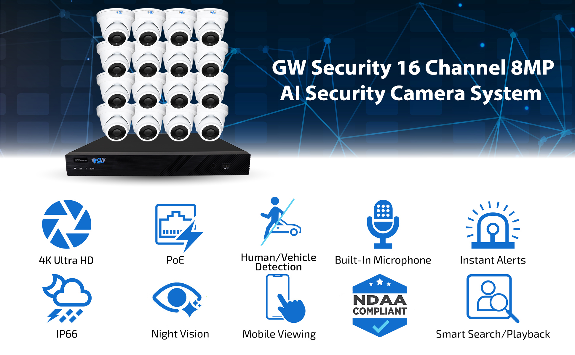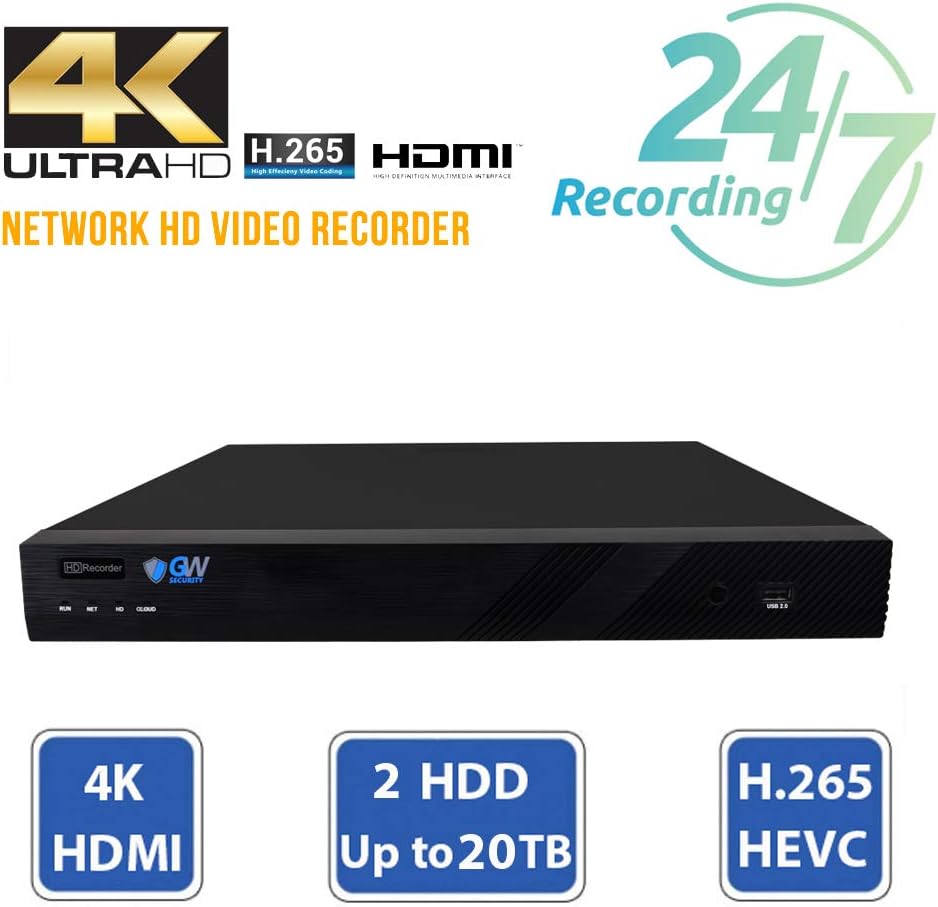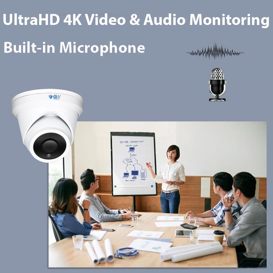 نظام كاميرا GW Security 16 قناة 4K NVR 8MP AI للكشف عن الإنسان والمركبات مع ميكروفون 16 UHD 4K 2160P PoE خارجي/داخلي مقاوم للماء IP Security Turret (أبيض)