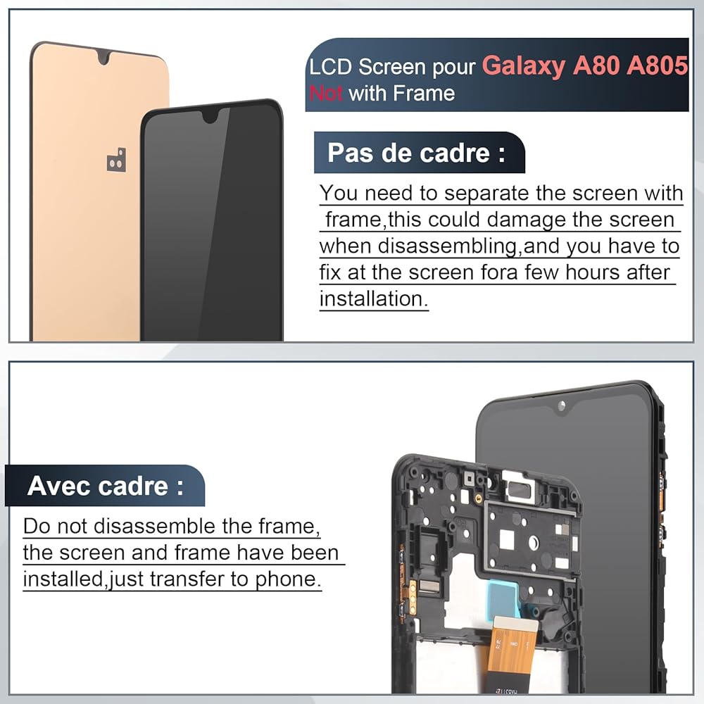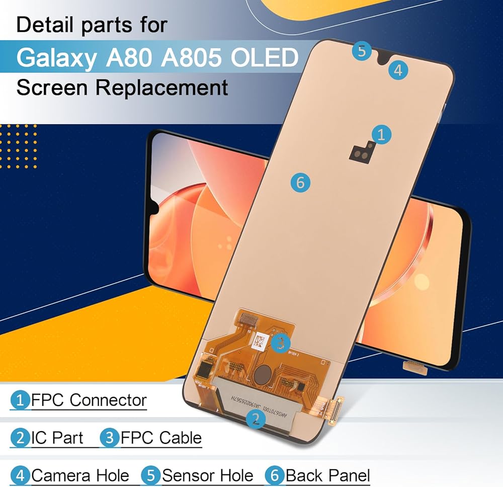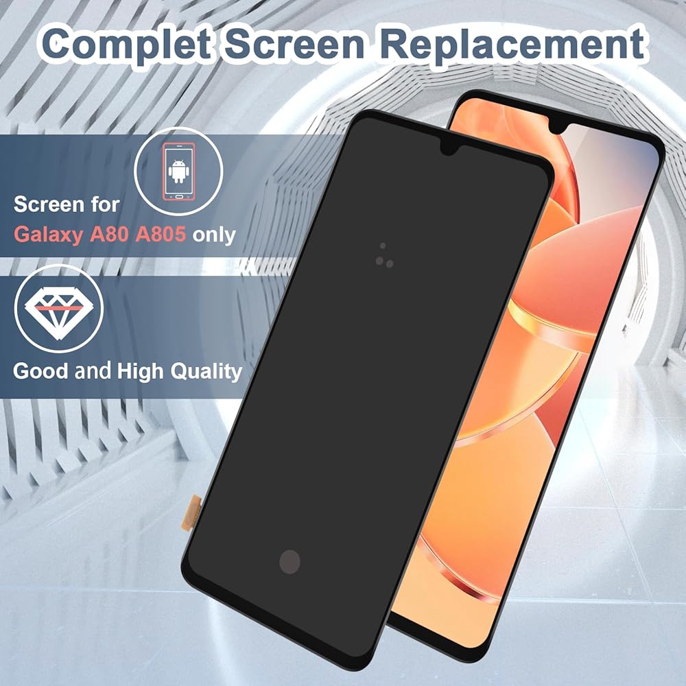♚سوف يصلح المشكلات: بالنسبة لشاشة Samsung Galaxy A80 A805 LCD ذات الإطار (العرض + الإطار + سماعة الأذن)، استبدل شاشة Samsung Galaxy A80 SM-A805F/DS التالفة، وأصلح مشكلات الشاشة المختلفة، مثل تكسر الشاشة، واللمس غير الحساس، تسرب السوائل، وضعف جودة صورة الشاشة، وانخفاض السطوع، وما إلى ذلك.