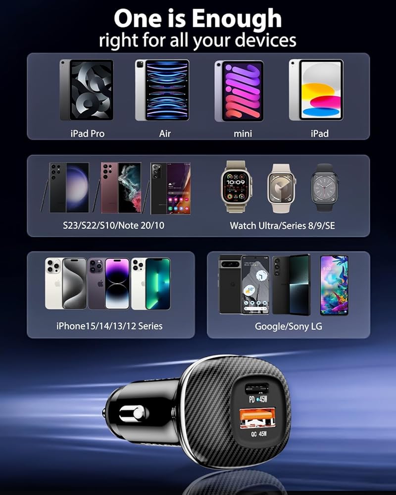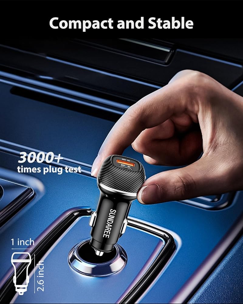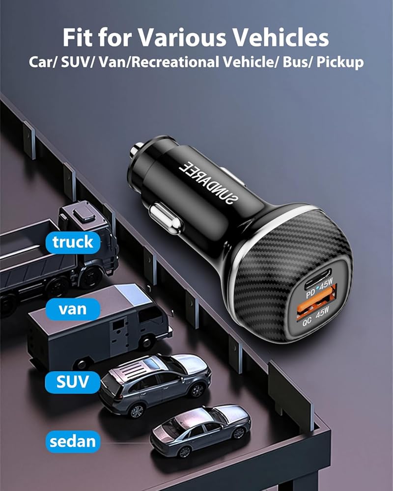 CARBON FIBER COVER, MORE ATTRACTIVE: The well-built body of the USB car charger with a carbon fiber cover brings a very sleek and sturdy feel compared with the usual plastic. The carbon fiber cover provides better heat dissipation, scratch resistance, and an enhanced design. With multiple safety certifications and a built-in smart IC,SUNDAREE car charger usb c can prevent overcurrent, short circuit, over-voltage, under-voltage, over-temperature, and overpower to protect your device.