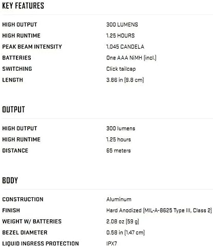 LIGHTEST, MOST COMPACT SCOUT LIGHT PRO: Virtually indestructible ultra-high-output LED generates 300 lumens of blinding light; produces tactical-level light for 1.25 hours on a single rechargeable AAA NiMH battery (included).