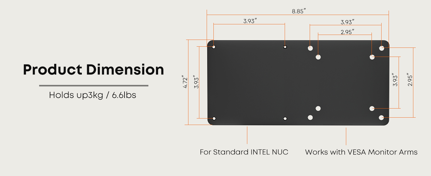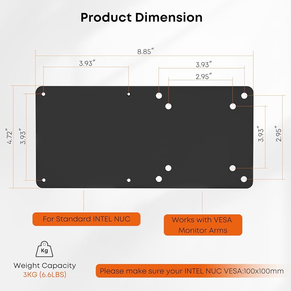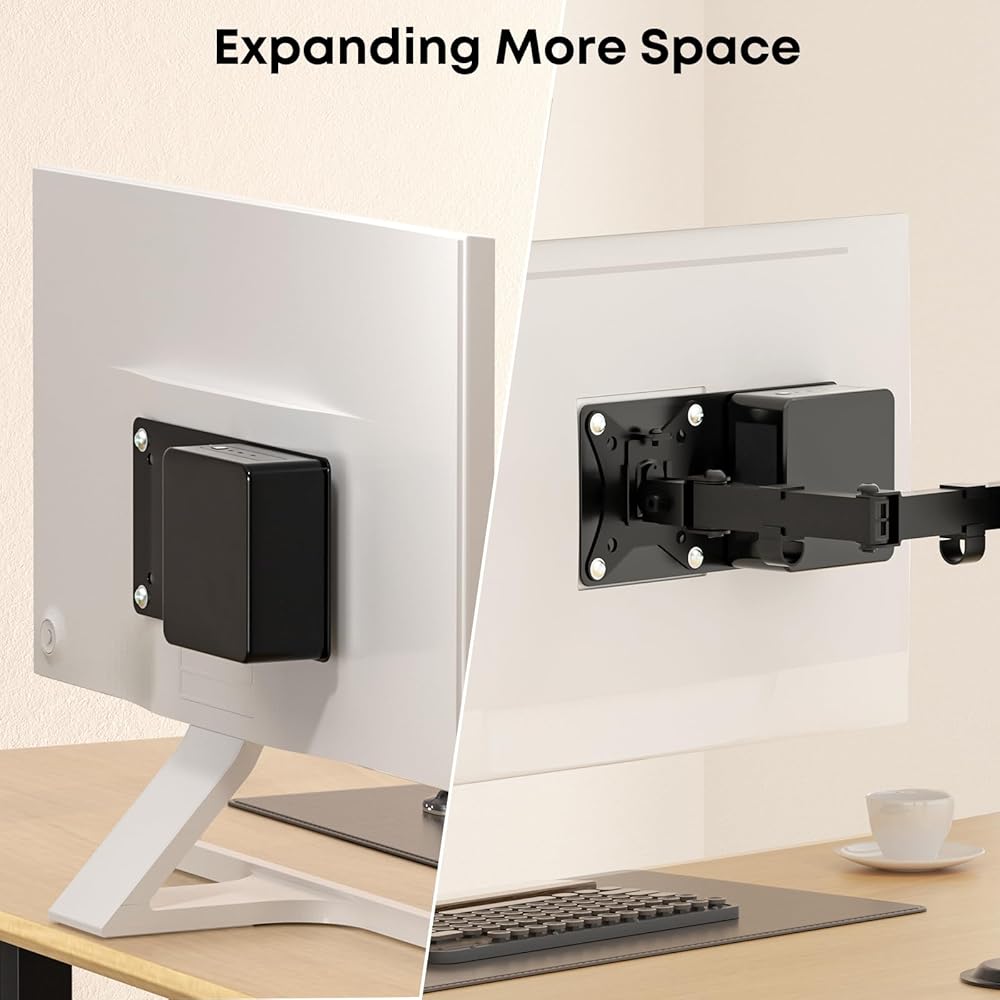 • وظيفة المحول: حامل كمبيوتر صغير عالمي مع أحجام تركيب VESA القياسية 75 × 75 مم و100 × 100 مم، لتركيب الأجهزة التي يصل وزنها إلى 6.6 رطل، مما يجعله ملحقًا أساسيًا لمستخدمي Mini PC وIntel NUC وMac Mini