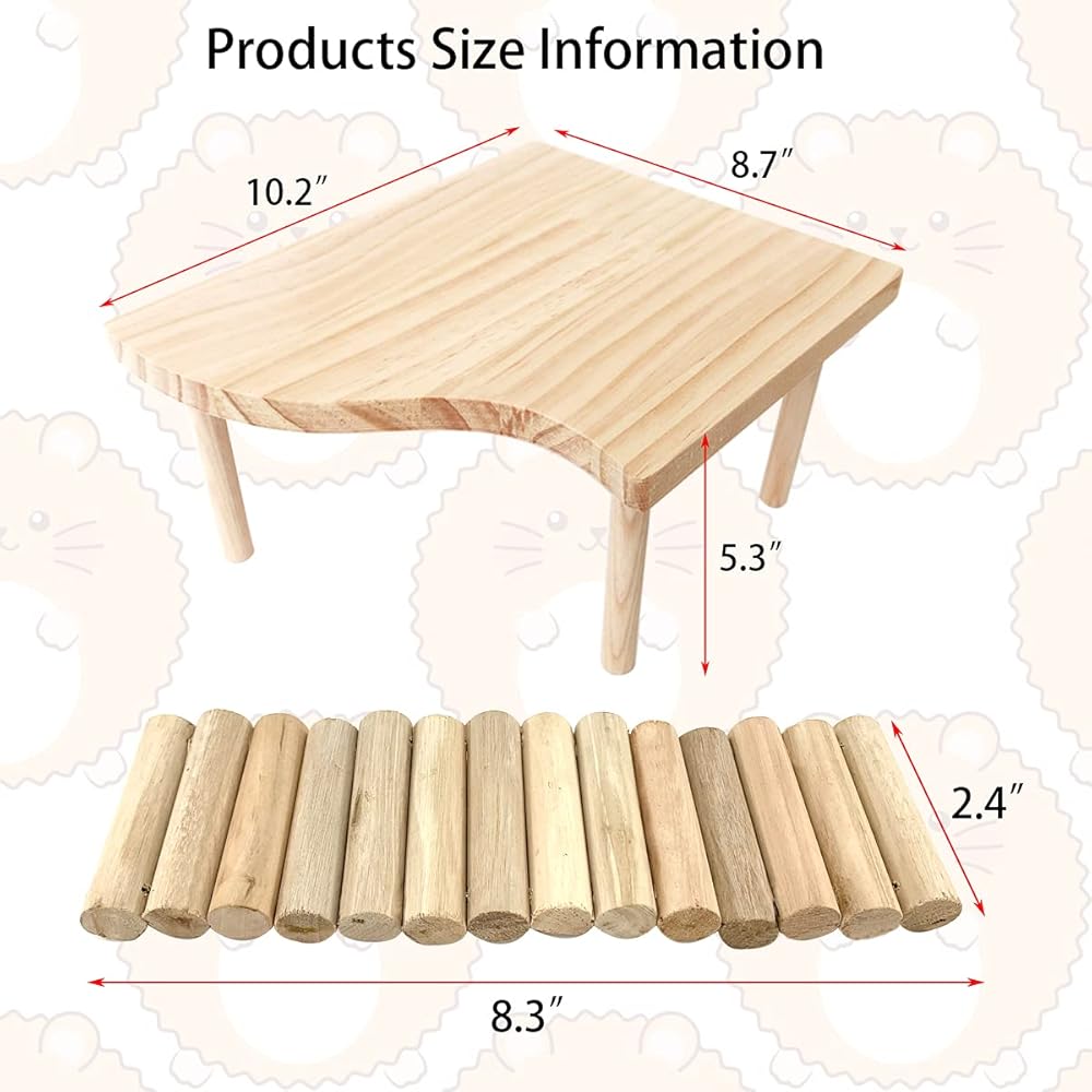 【Material and Size】-The small animal exercise platform and bendable ladder are made of pine wood with CNC cutting and hand grinding. The natural solid wood material has not been treated with any glue and paint, durale and safe for hamster to climb, nibble and play. The lengths of the table sides are 7.5*8.7*10.2", the total height of the hamster platform is 5.3". The length and width of the hamster ladder bridge is 8.3*2.4", special for small pets such as gerbils mice rats.