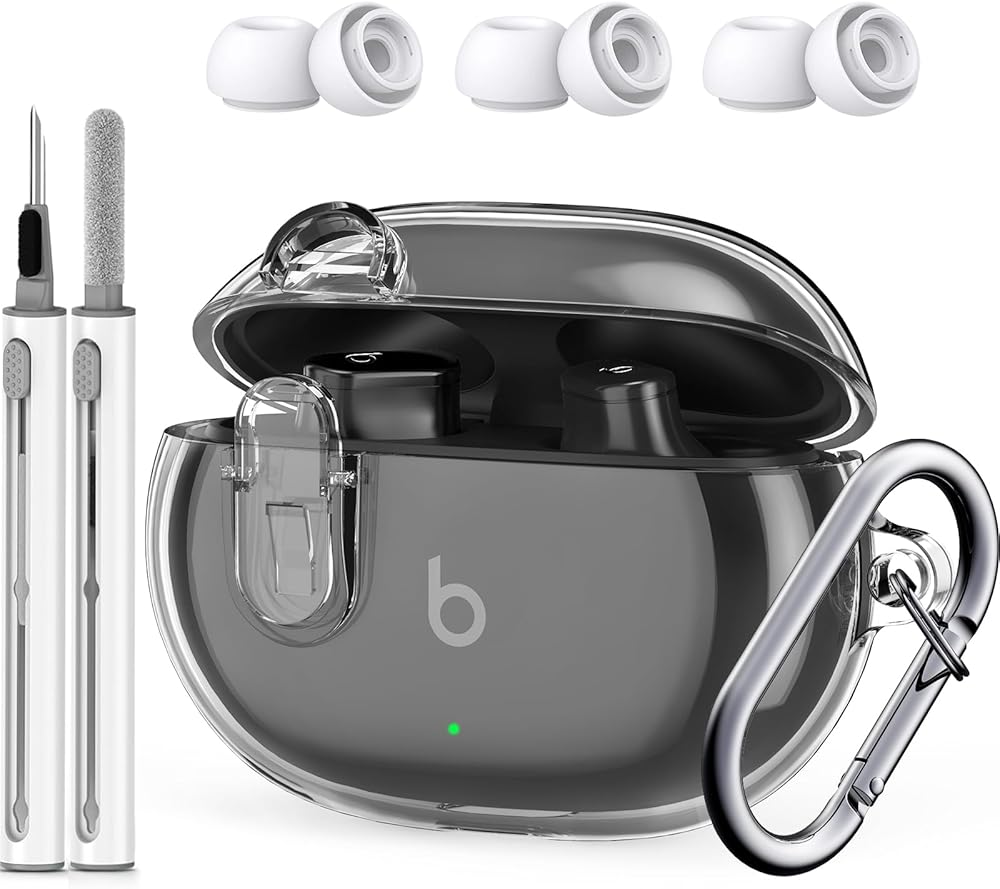 [محتويات العبوة] 1 × حافظة Beats Studio Buds Plus الشفافة، 1 × حلقة تسلق مضادة للفقد، 1 × قلم تنظيف، 3 أزواج من وسائد الأذن (S/M/L). ‼(يُرجى ملاحظة: سماعات Beats Studio Buds وعلبة الشحن غير متضمنة).