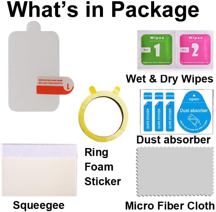 Package Included 6 x soft screen protectors; 6 x dry and wet wipes; 6 x dust removal stickers; 1 x micro fiber cloth, 1x Squeegee, 1 x Foam Ring Sticker