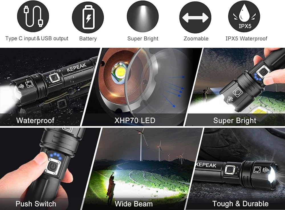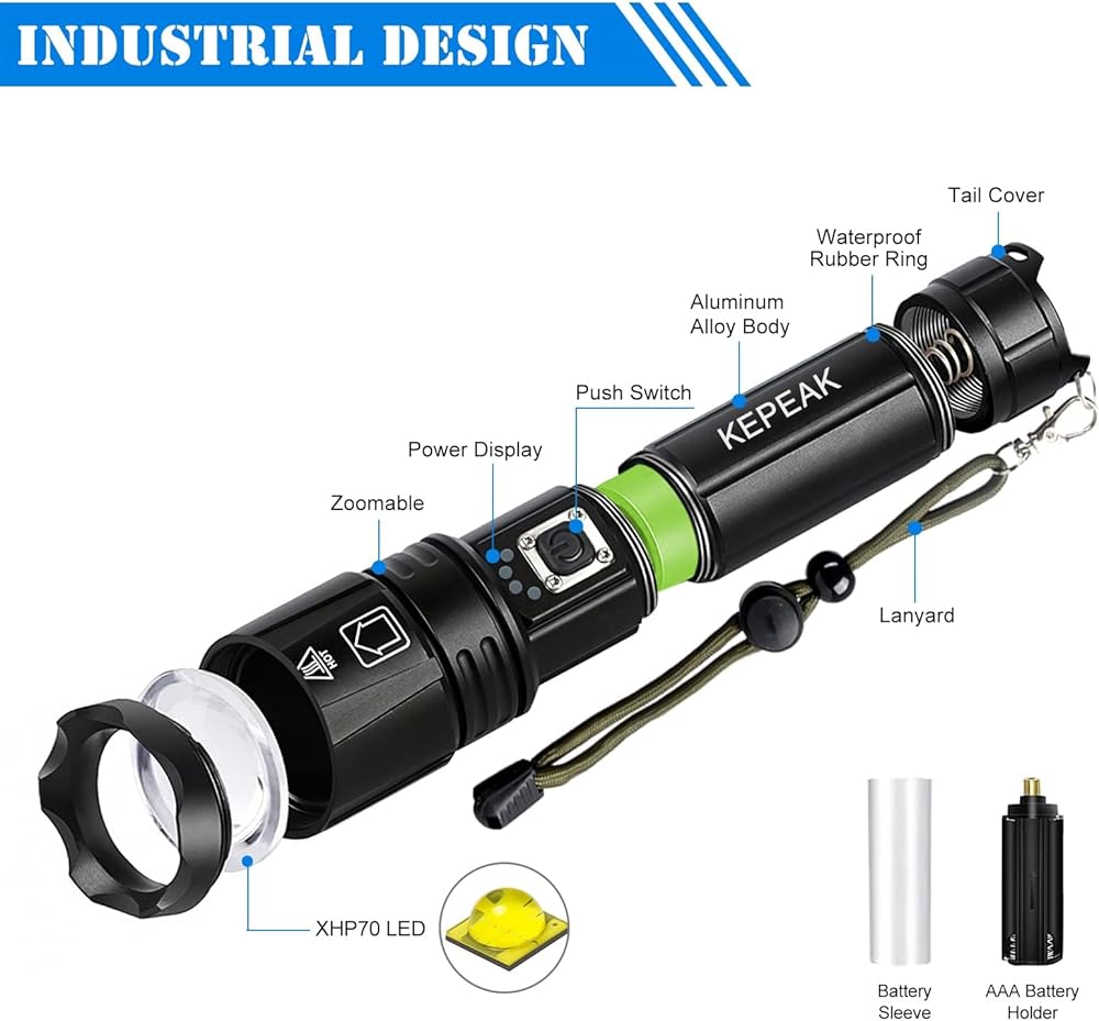 [مصباح يدوي فائق السطوع، يضيء كل شيء تقريبًا] تم تجهيز المصباح اليدوي الأكثر سطوعًا لدينا بشريحة LED مطورة، مما يوفر ضوءًا ثابتًا ومشرقًا للغاية مع ما يصل إلى 990,000 لومن. إنه يوفر إضاءة قوية بشكل لا يصدق لتلبية الاحتياجات المختلفة، سواء كنت تخييم أو تتعامل مع انقطاع التيار الكهربائي. سطوع هذا المصباح الساطع يغرس الثقة والشعور بالأمان