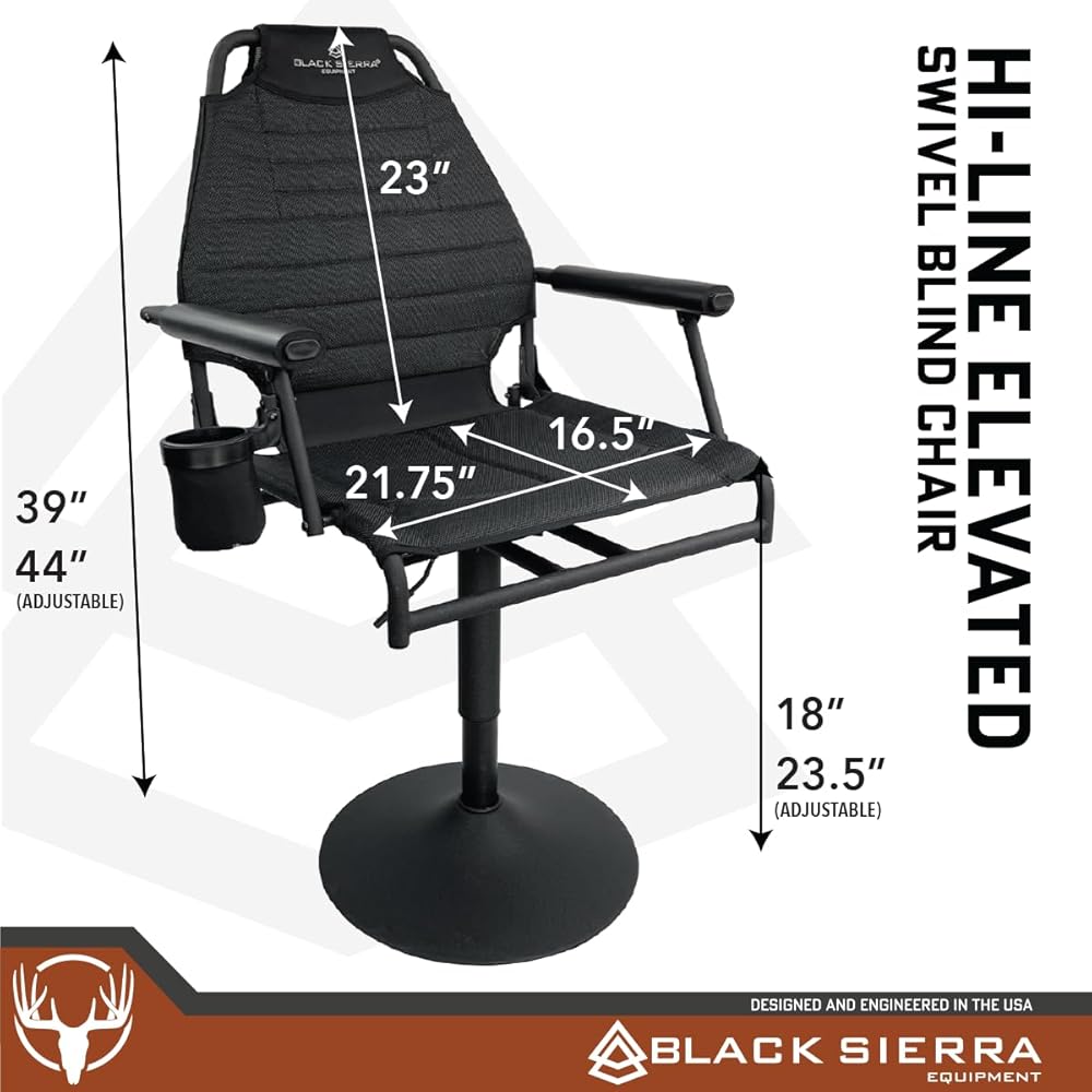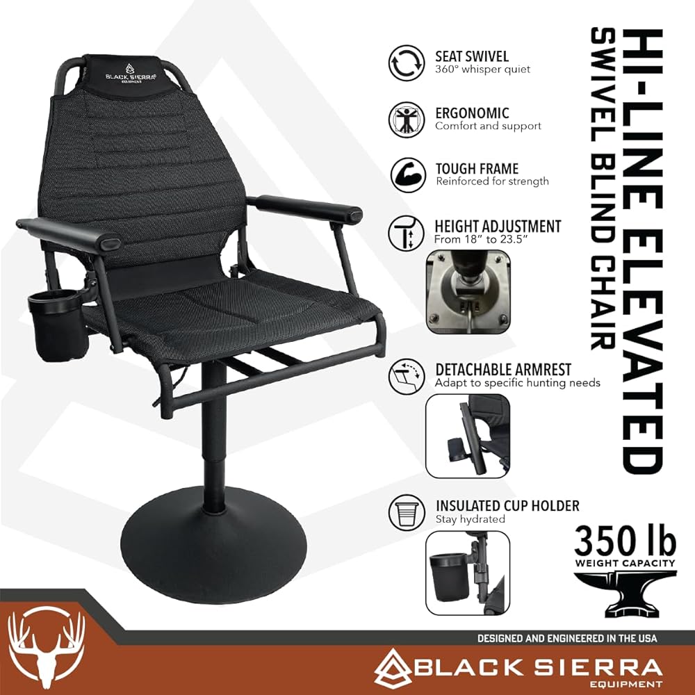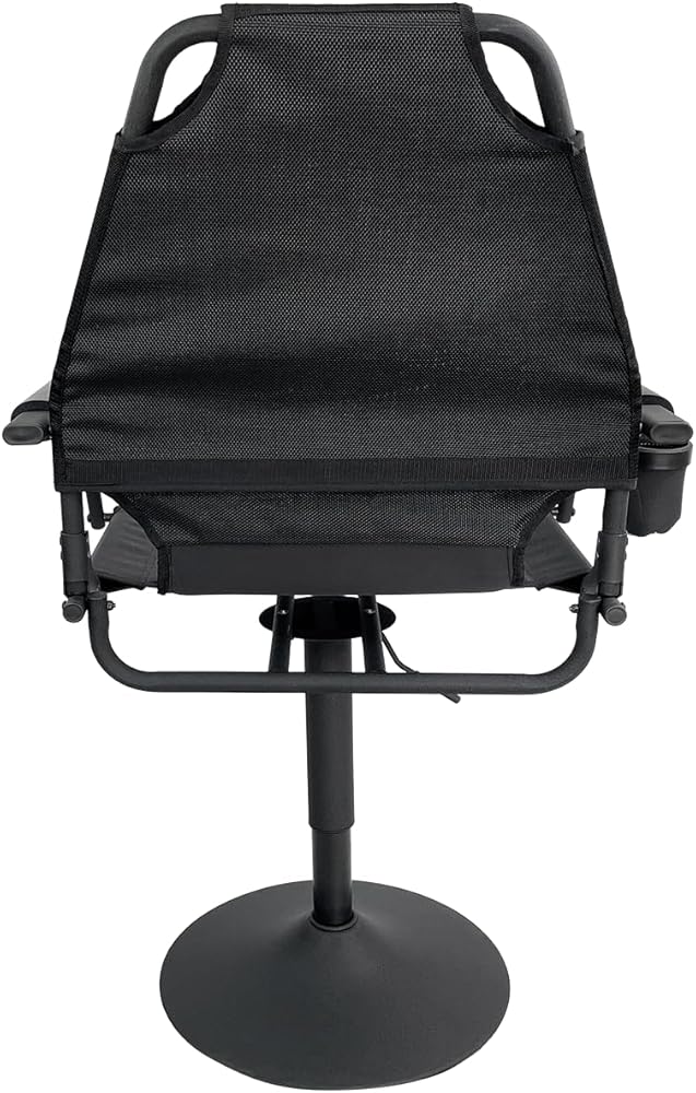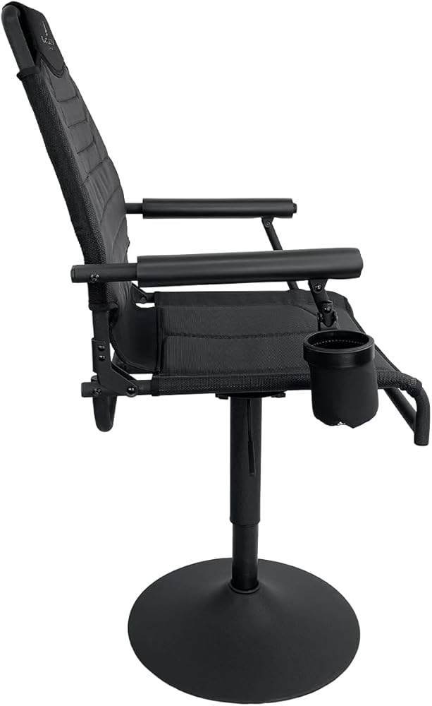 كرسي صيد أسود سييرا صامت بزاوية 360 درجة، مقعد صيد أرضي بارتفاع قابل للتعديل يتميز بحامل أكواب معزول وقاعدة على شكل مقعد للبار، إطار فولاذي عالي التحمل يدعم 350 رطلاً.
