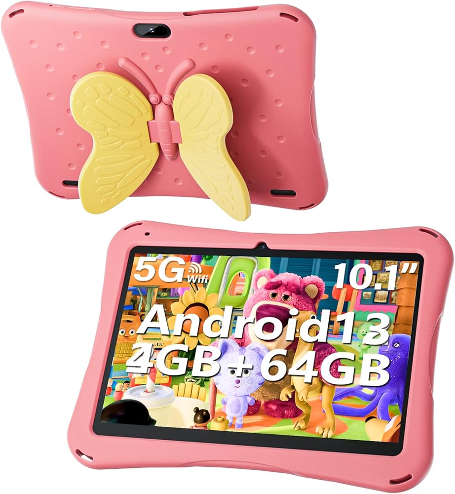 تابلت 10 بوصة للأطفال، تابلت أندرويد 13 للأطفال مع حافظة للأطفال، ذاكرة وصول عشوائي 4 جيجابايت وذاكرة قراءة فقط 64 جيجابايت، 5000 مللي أمبير، كاميرا مزدوجة، شاشة 1280 * 800، واي فاي، كيدوز مثبت مسبقًا، مقبض فراشة (وردي)