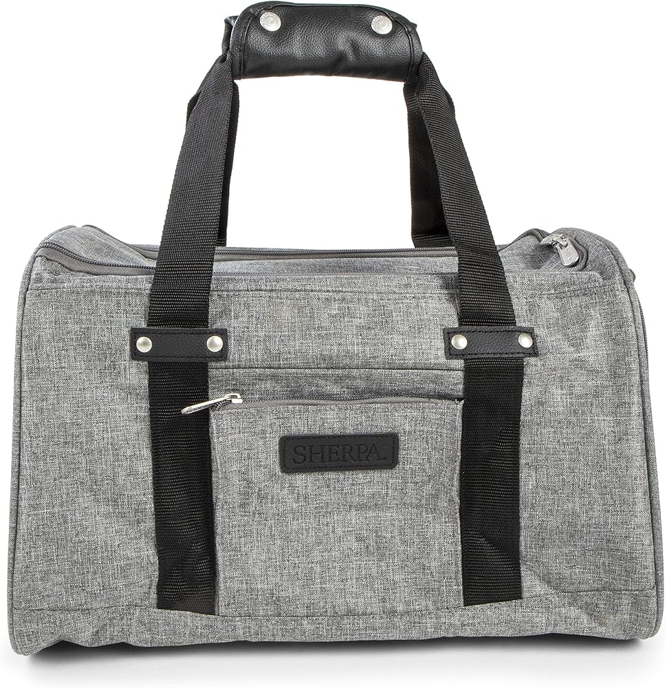 Travel in comfort and style with Sherpa Element Pet Carrier. Perfect for traveling by plane or car, for a trip or just to the vet. Patented spring wire frame allows the rear end of the carrier to be pushed down several inches to conform to under-seat requirements. The carrier has mesh panels for ventilation, locking zippers to prevent accidental escapes, and includes a seat belt security strap which doubles as a luggage strap. Top and side entry options make it much easier to comfortably load pets in the carrier. A soft, cozy, removable, and machine-washable faux lambskin liner is included. Approved for use on most major airlines and included in Sherpa's On-Board program. Our new keep it clean fabric and handles allows you to keep the inside and outside of this bag cleaner longer. Sherpa Travel gives pet parents the best of all worlds: innovative products, stylish designs, and exceptional value with a variety of travel carriers, leads, mats, straps, to meet a pet's and pet parent's needs for travel. Sherpa products are designed to meet child safety standards. Please read all packaging instructions, warnings and cautions upon receipt. Packaging contains small parts, discard after opening.