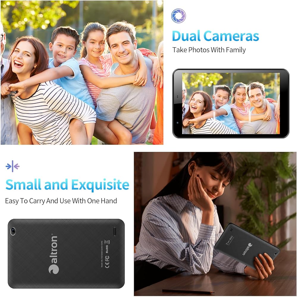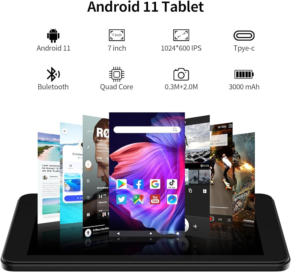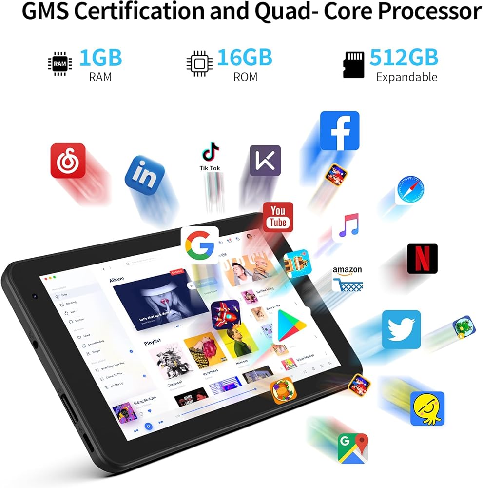 Android OS Tablet: Tablet has Android OS and has outstanding features that make it smooth and fast to use.7 inch tablet is certified by Google and you can download many free apps from the app shop such as YouTube/Facebook/Twitter. etc.