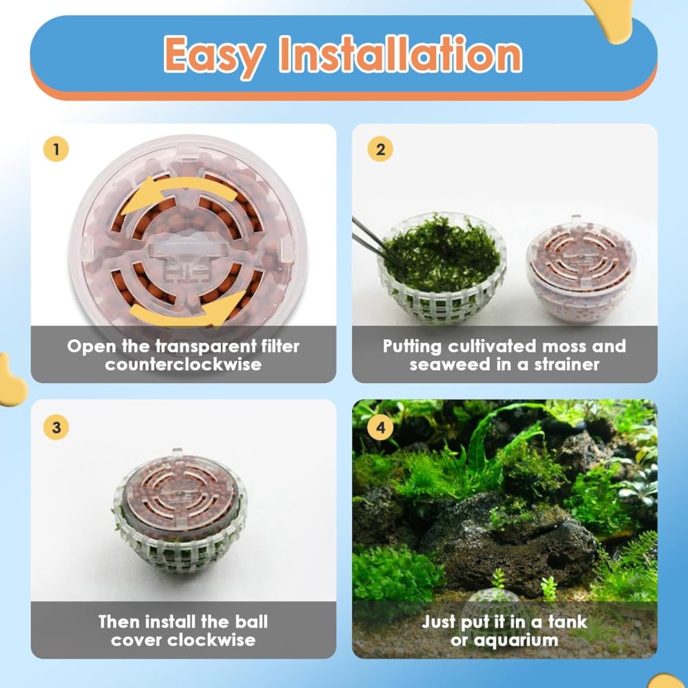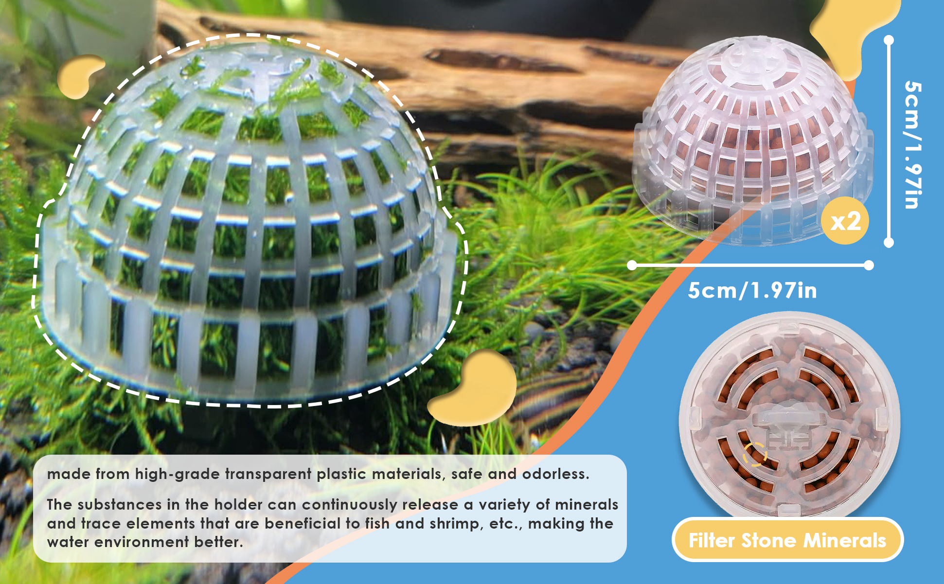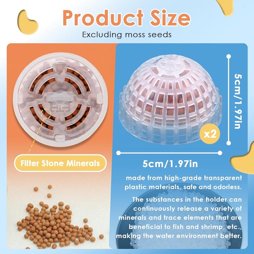 يوفر حامل الكرات الطحلبية مكانًا رائعًا للاختباء والإيواء للأسماك والمخلوقات، بينما يتميز الجزء الداخلي أيضًا بحجر فلتر يطلق المعادن في الماء، مما يساعد في ترشيح المياه، ويسمح بنمو أسرع للنباتات، ويحسن الصحة العامة للنبات. حوض السمك.