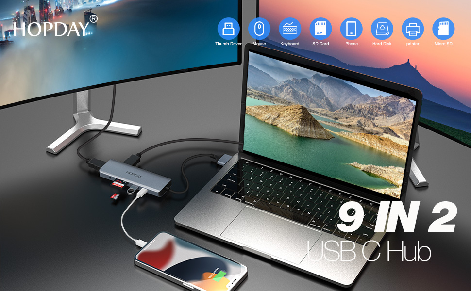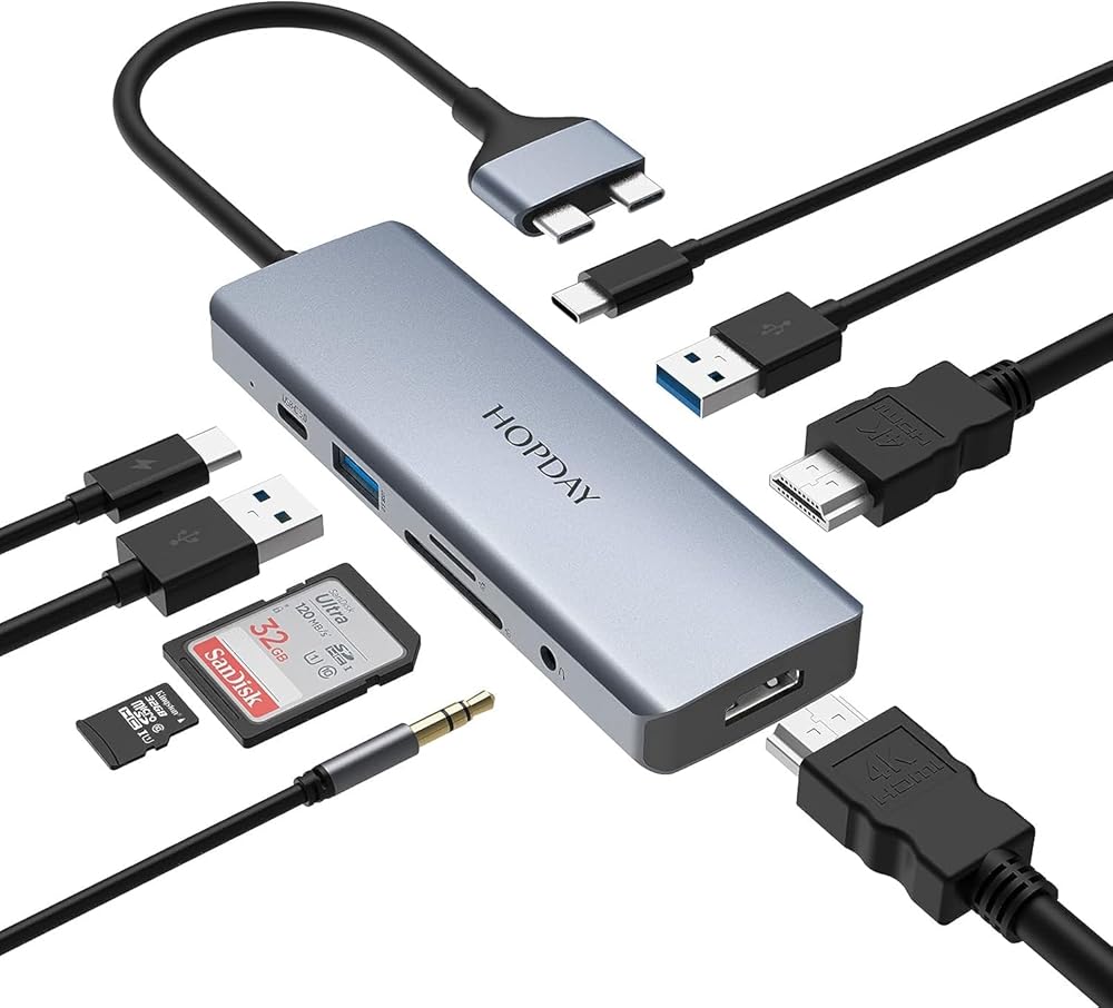 محطة إرساء USB C من HOPDAY - محور USB C 9 في 2 - دعم HDMI ثلاثي الأبعاد بدقة 4K، دونجل USB C لجهاز MacBook Pro/Air (100W PD، USB 3.0، قارئ بطاقة SD/TF، صوت 3.5 مم)