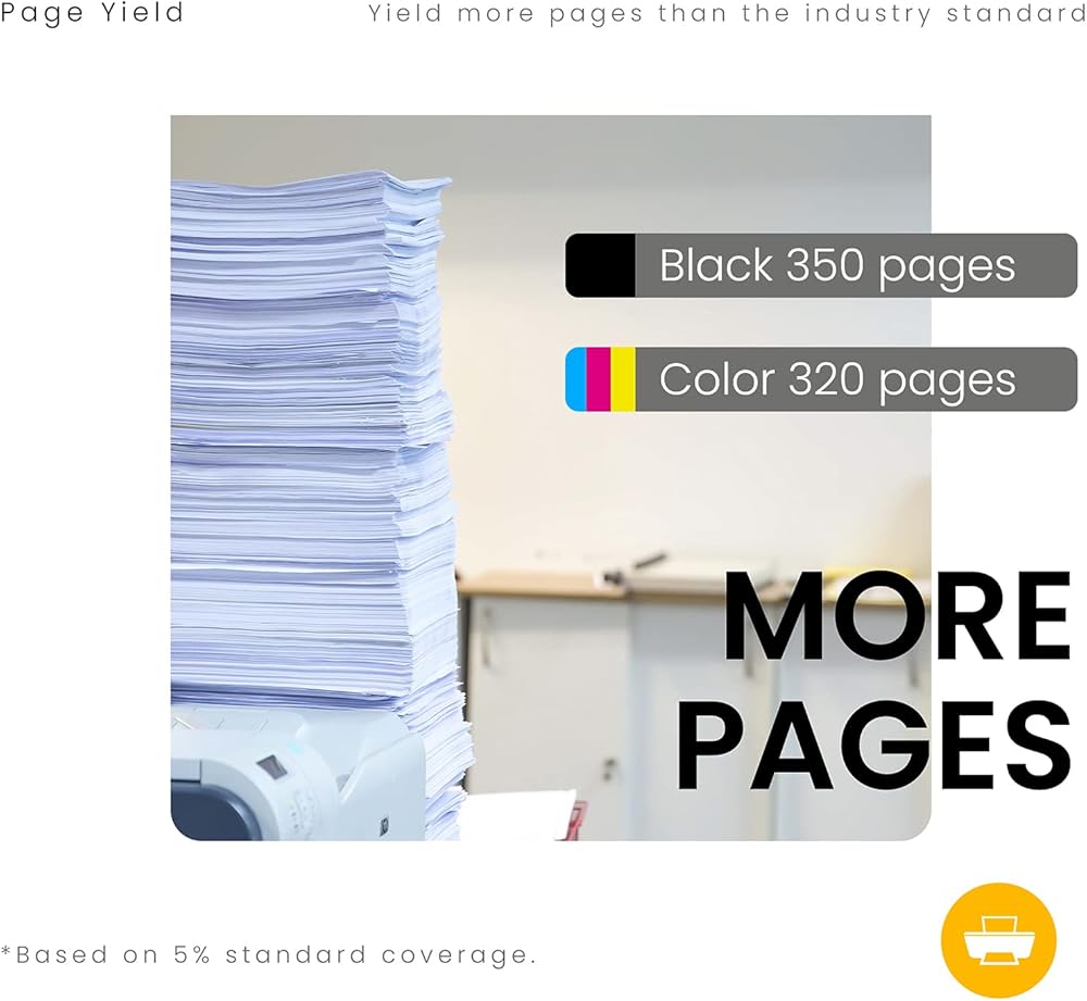 إنتاجية عالية للصفحة: ما يصل إلى 350 صفحة لكل 243 حبرًا أسود، و320 صفحة 244 حبرًا ملونًا بتغطية 5% لمعيار ISO. *يرجى ملاحظة أن إنتاجية الصفحة ستتأثر بالاستخدام في العالم الحقيقي