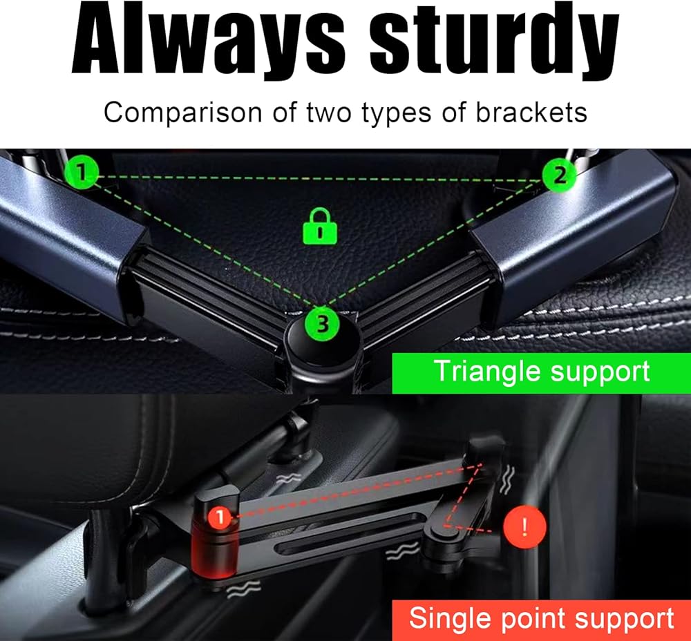 Newest Triangle Structure: The newest car tablet mount adopts a triangle framework that can be folded, extended, and positioned however you wish. It saves space and is more stable than other car headrest mounts on the market. The components are foldable and light, making them easier to carry when traveling.