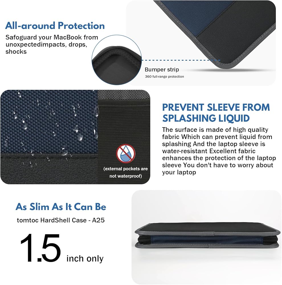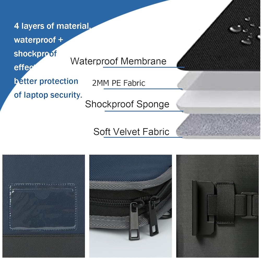 خامة ممتازة: نسيج أكسفورد مقاوم للماء 600D، والذي يمكن أن يمنع بشكل فعال الغبار والأوساخ والحطام والخدوش، وبطانة داخلية ناعمة، بالإضافة إلى تصميم مضاد للتصادمات 360 درجة. ستكون حافظة الكمبيوتر الخاصة بنا حماية أكثر حميمية لجهاز الكمبيوتر المحمول الخاص بك