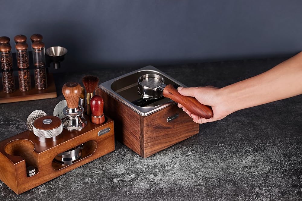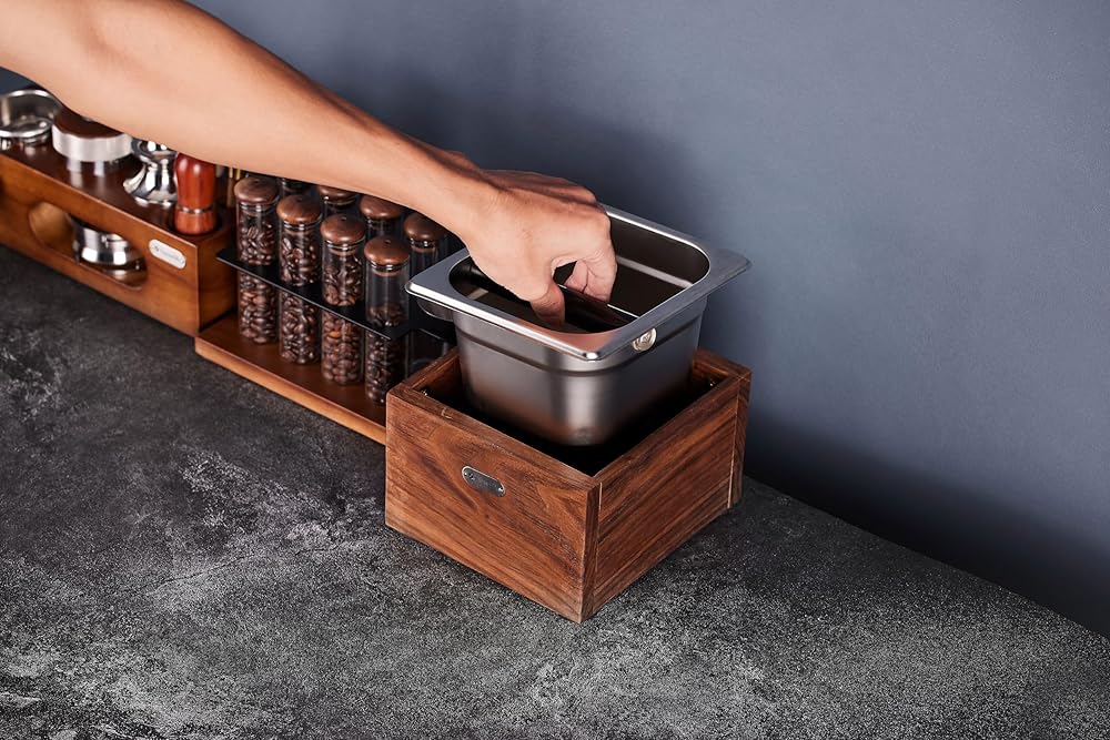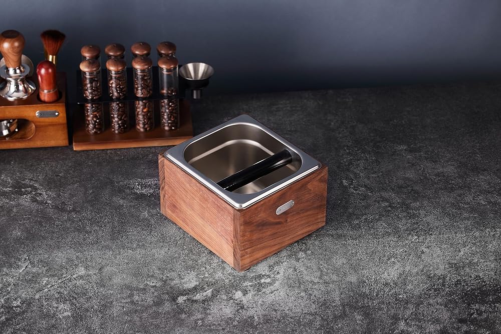 تصميم رائع وإنتاج دقيق: صندوق الإسبريسو الخاص بنا مصنوع من الفولاذ المقاوم للصدأ عالي الجودة وخشب الجوز، مما يضمن تأثيرًا قويًا ومستقرًا بالإضافة إلى التصميم الأنيق. إنه مشهد جميل على زوايا القهوة المنزلية وبارات القهوة.