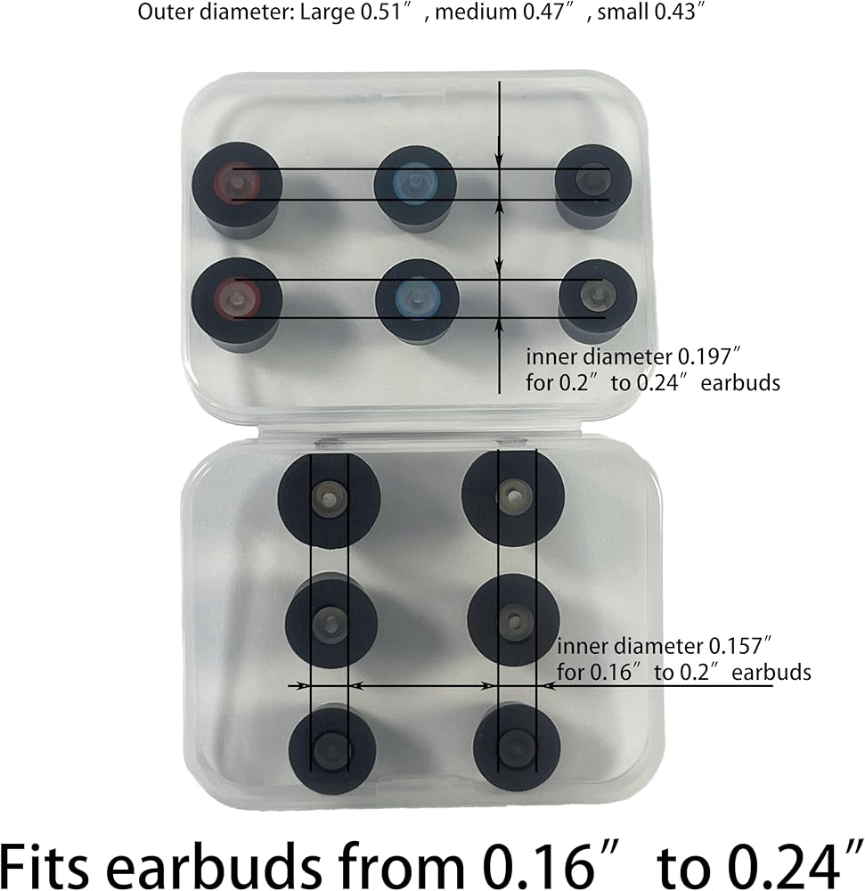 بالنسبة لسماعات الأذن بقطر 4.1 مم إلى 6 مم (0.16 بوصة إلى 0.24 بوصة)، يوجد نوعان من القطر الداخلي، 3 أزواج بقطر داخلي 0.157 بوصة، و3 أزواج أخرى بقطر 0.197 بوصة. لا داعي للقلق بشأن ترك الطرف على أذنك الأذن عند إخراج سماعات الأذن.