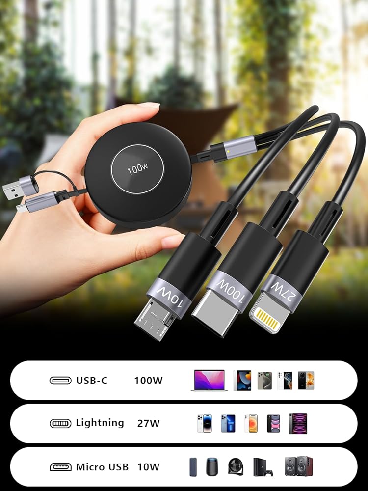 100W Super Fast Charging Cable:The Retractable USB C to Multi Charger Cable with E-Mark chip intelligently,by automatically adjusting the power;100W Super Fast Charger Cable can fast recharge with USB C (100W),USB C to Lightning (27W),USB C to Micro (10W)