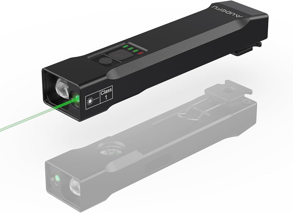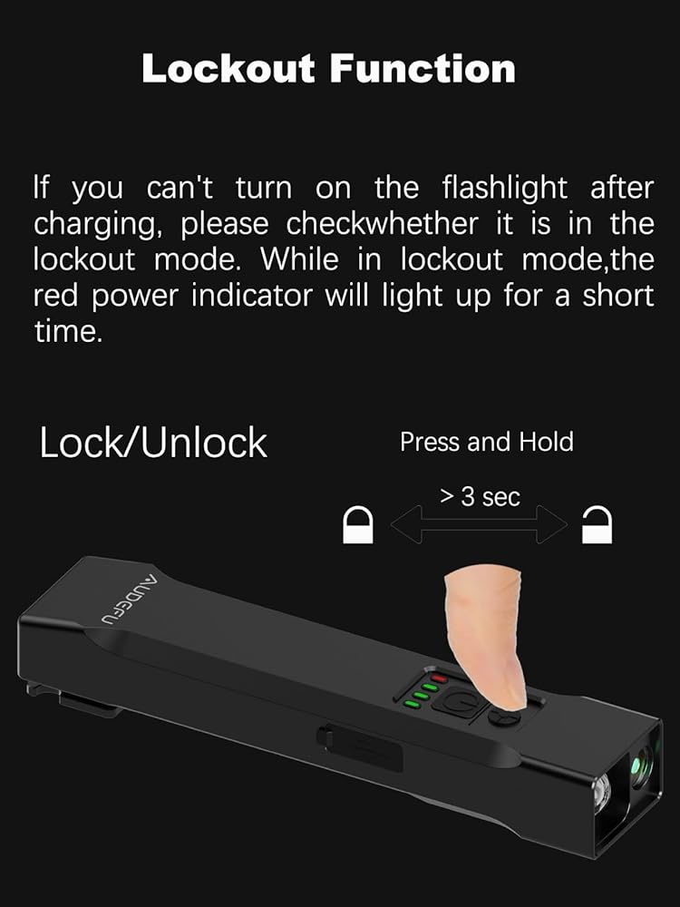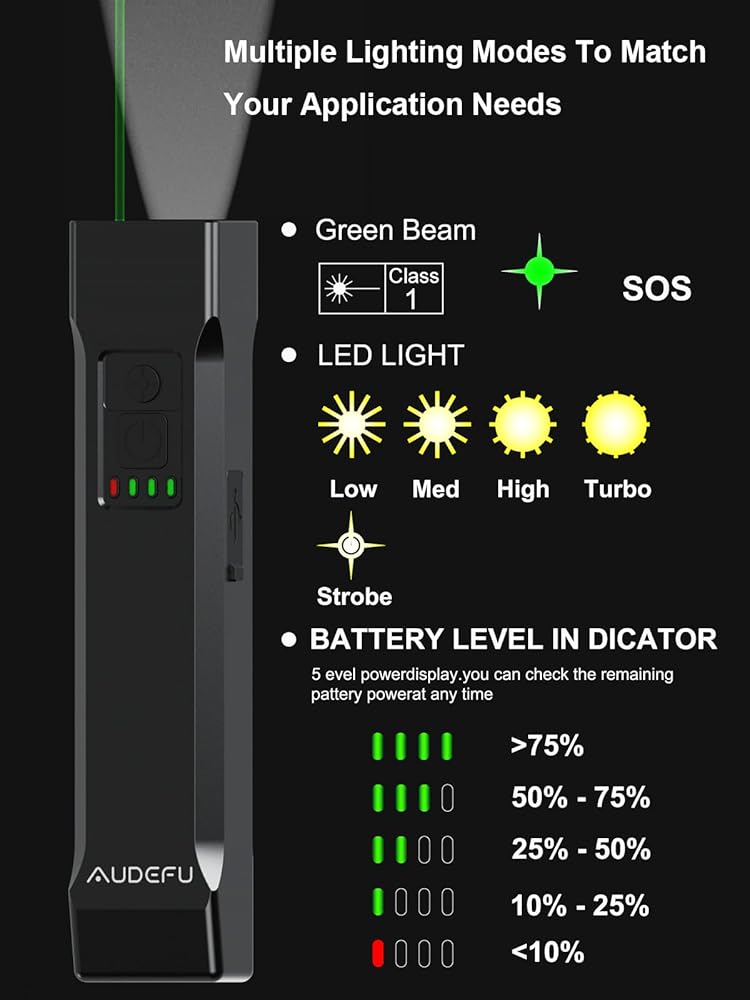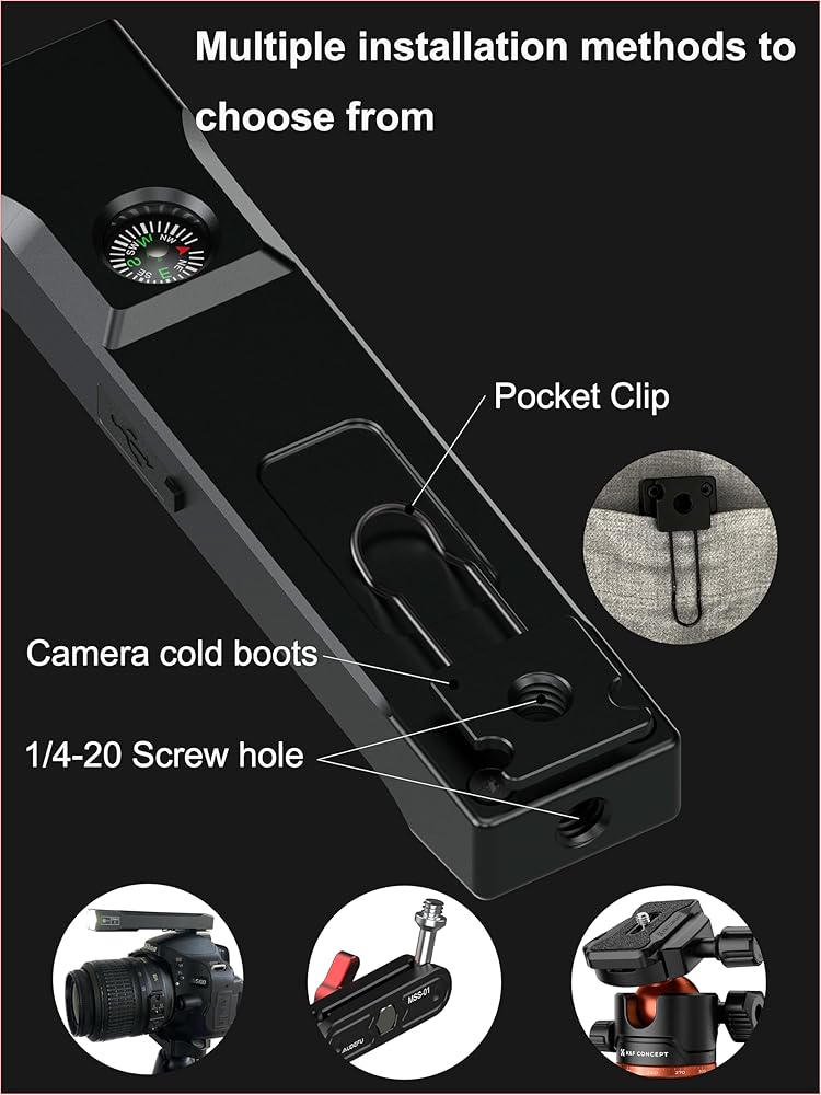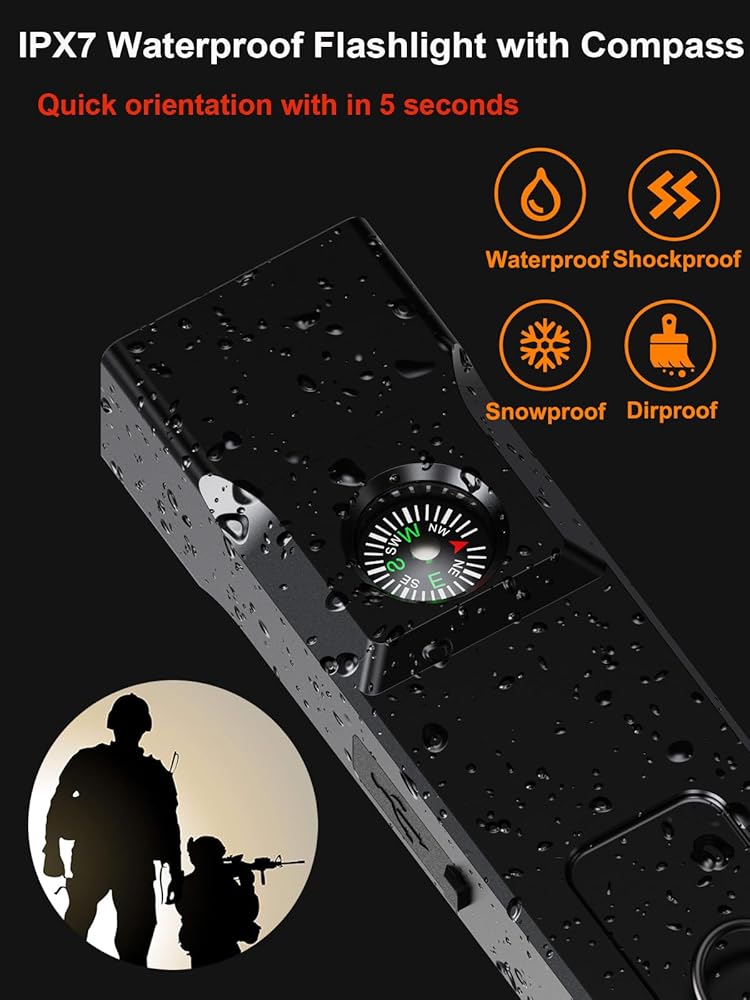 مقاوم للماء ومتين: مصباح يدوي قابل لإعادة الشحن مع مؤشر ليزر وبوصلة مقاوم للماء IP67 ويمكنه تحمل الغمر في 2 متر من الماء لمدة 30 دقيقة. إنه مصنوع من الألومنيوم المستخدم في مجال الطيران والفضاء مع لمسة نهائية صلبة مؤكسدة ومضادة للكشط. يتميز بتصميم متين ومقاوم للسقوط.