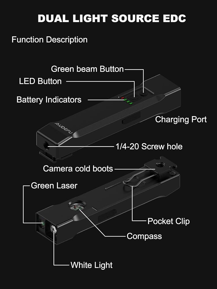 مصدر ضوء مزدوج: مصباح يدوي EDC عالي الأداء مع مصادر إضاءة مزدوجة، شعاع أخضر وLED أبيض، شعاع أخضر مثالي للحفاظ على الرؤية الليلية، في حين أن ضوء LED الأبيض مناسب للاستخدام العام.