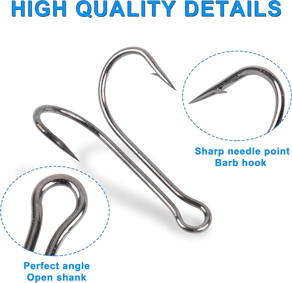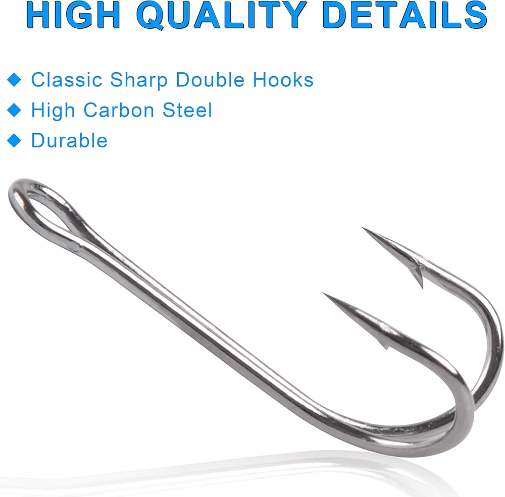 خطافات مزدوجة ممتازة - خطافات صيد مزدوجة بنقاط إبرة حادة. يتم طحن طرف الخطاف بشكل متكرر مما يضمن الحدة وصعوبة الكسر. يمكن استخدامه كخطاف بديل للرقص والمقابس