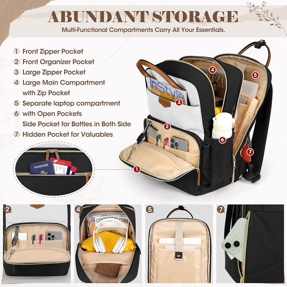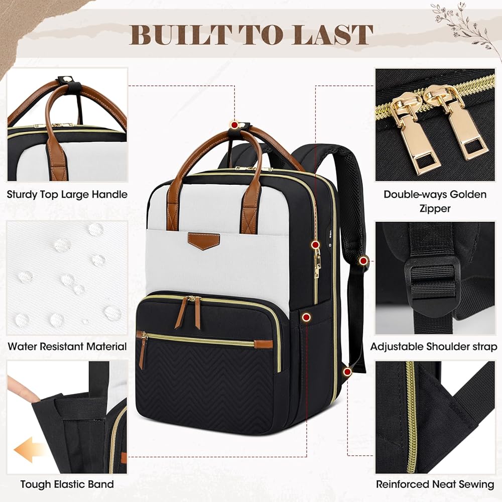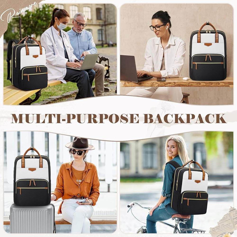 حقيبة ظهر RAINSMORE للنساء، 15.6 بوصة حقيبة ظهر للكمبيوتر المحمول للسفر حقيبة ظهر للكمبيوتر الجامعي للمدرس والممرضات حقيبة ظهر للعمل مقاومة للماء حقيبة ظهر كاجوال لحقيبة الكتب للسفر المكتبي، أبيض وأسود